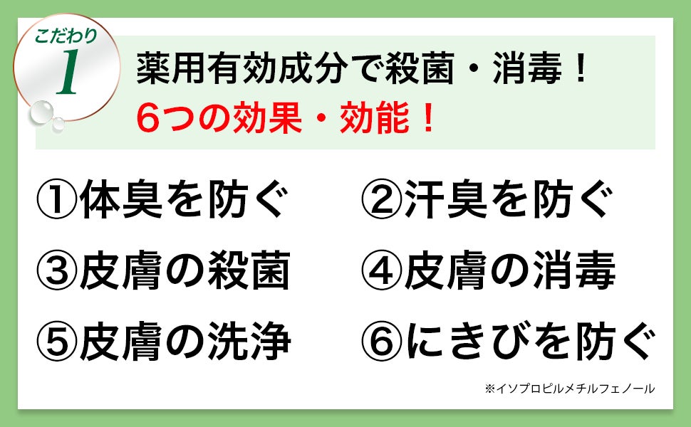 全身のニオイの元となる雑菌類を根本から除去し、有効成分イソプロピルメチルフェノール配合の泡で、殺菌・消毒してしっかり洗い落とします。