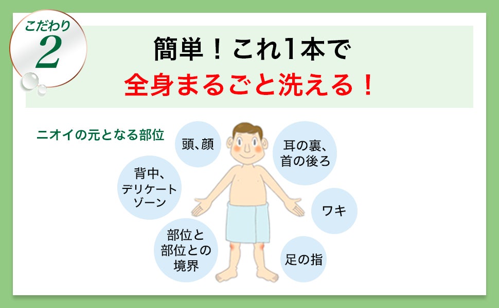 ニオイが強まる部位で特に要注意なのが耳の裏や首の後ろ、ワキ、足の指、背中やデリケートゾーンです。頭や顔のまわりをボディソープとシャンプーで使い分けしていると肝心なところに洗い残しが出来てしまいがちに。薬用デオ・ソープなら全身まるごと洗えます!