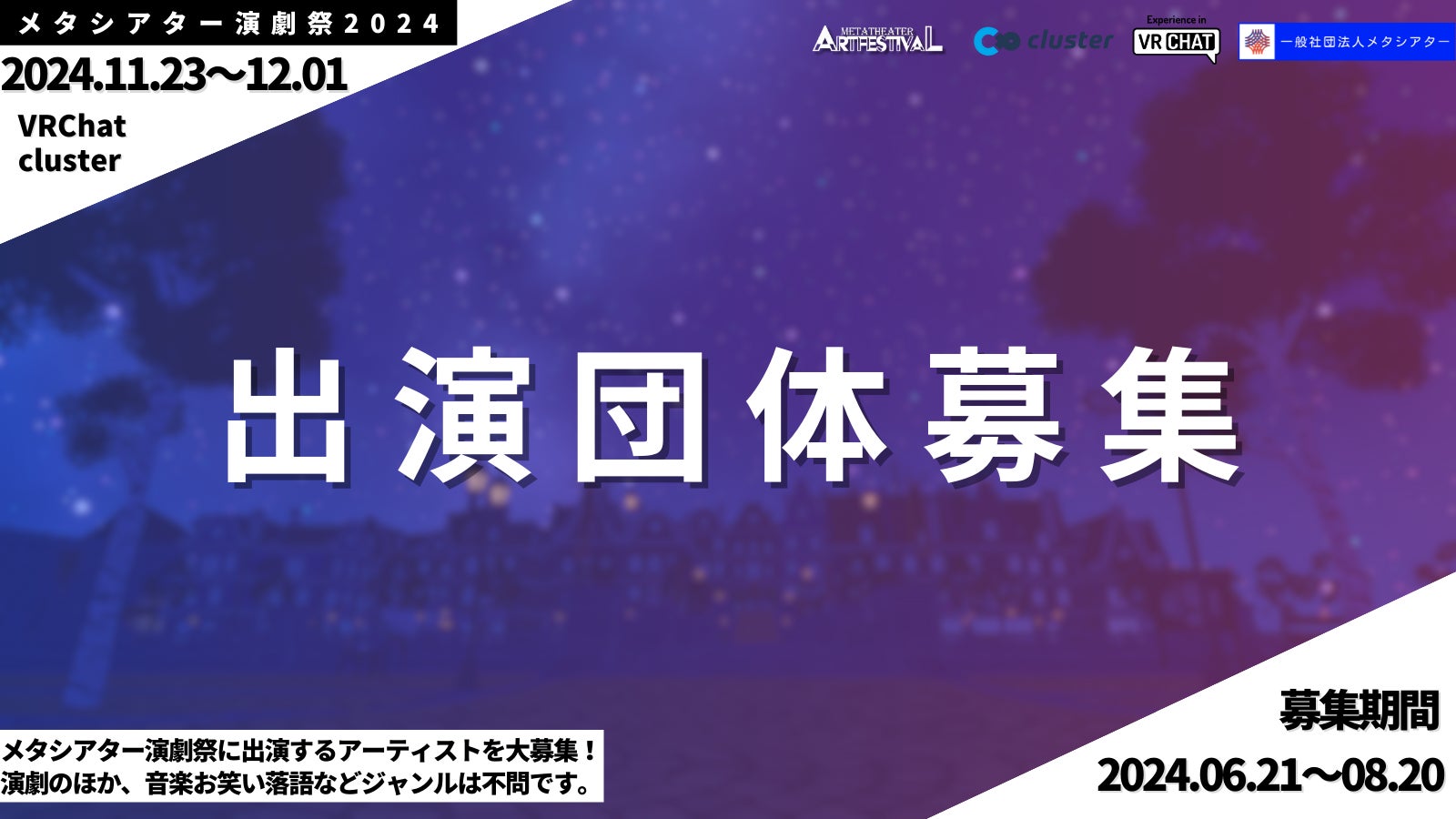 一般社団法人メタシアターは、昨年ボランティアによって組織された成功した演劇祭をきっかけに、て設立されました。私たちの使命は、VRで活躍するパフォーマーを支援し、より多くの観客が様々なパフォーマンスをVRで体験できるようにすることで、彼らのVR体験を豊かにすることです。メタシアター演劇祭は、VRChat上での演劇、ダンス、ライブパフォーマンスを加速させることを目指している私たちの主な活動です。このイベントを毎年継続して開催する予定です。