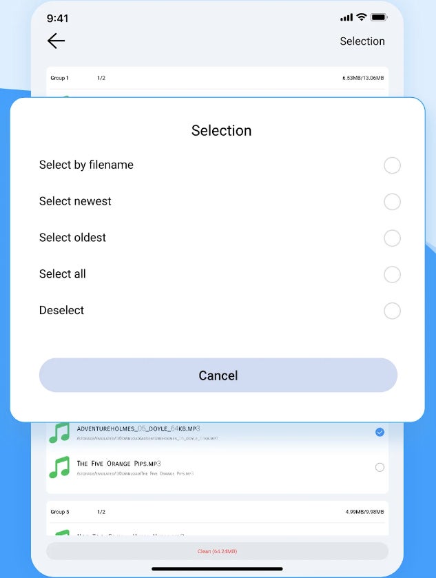 Duplicate Finderが各グループの重複ファイルから自動で1つのファイルを残し、他のファイルを選択して削除しますので、ユーザーはワンタップで全ての重複ファイルを削除できます。