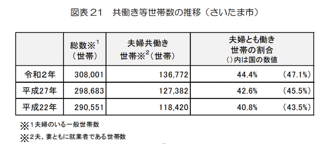 さいたま市の専業主婦世帯は年々減少傾向にある一方で共働き世帯は近年は急速に上昇しており、今後もその傾向は強まると見られます。