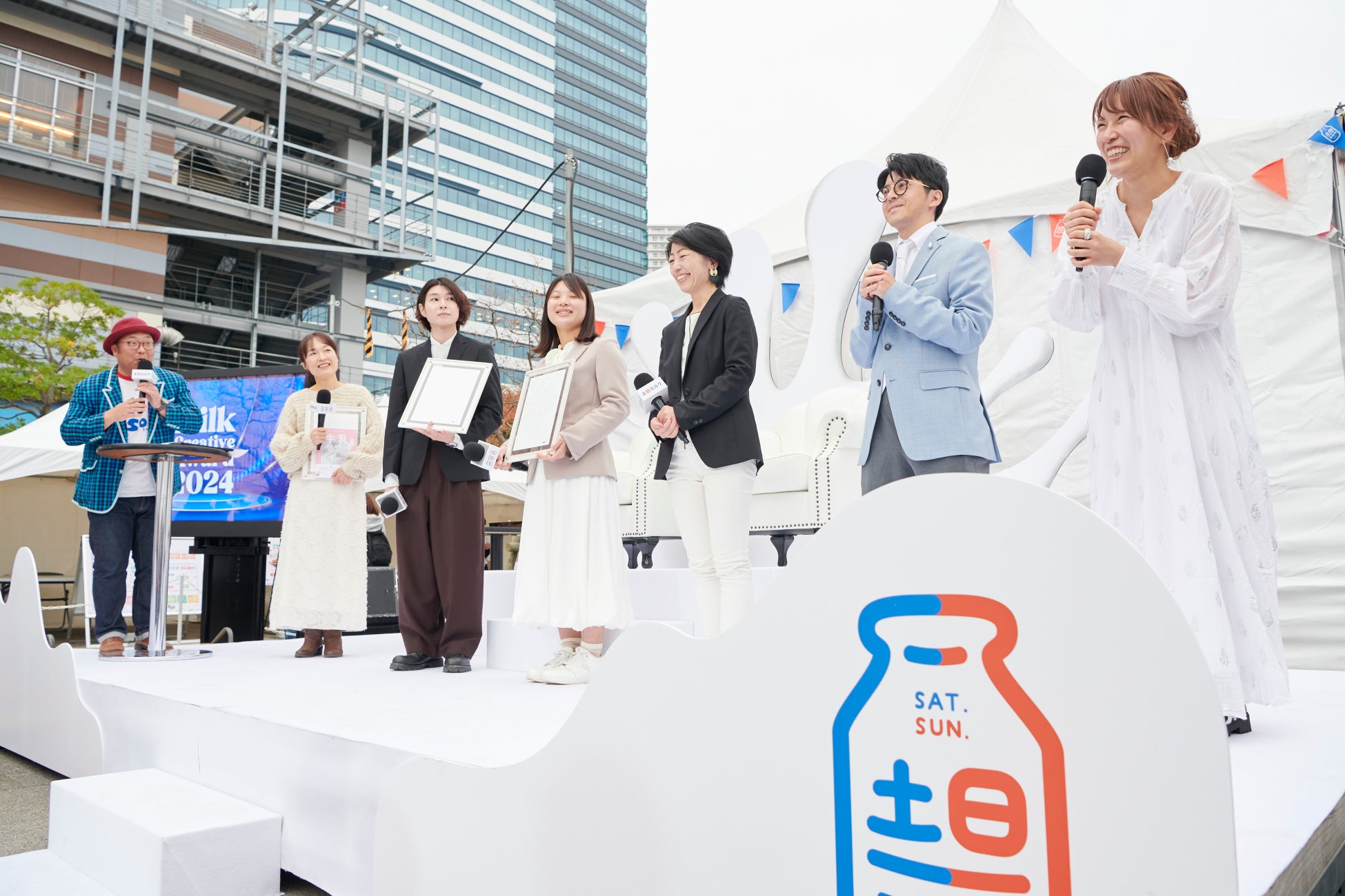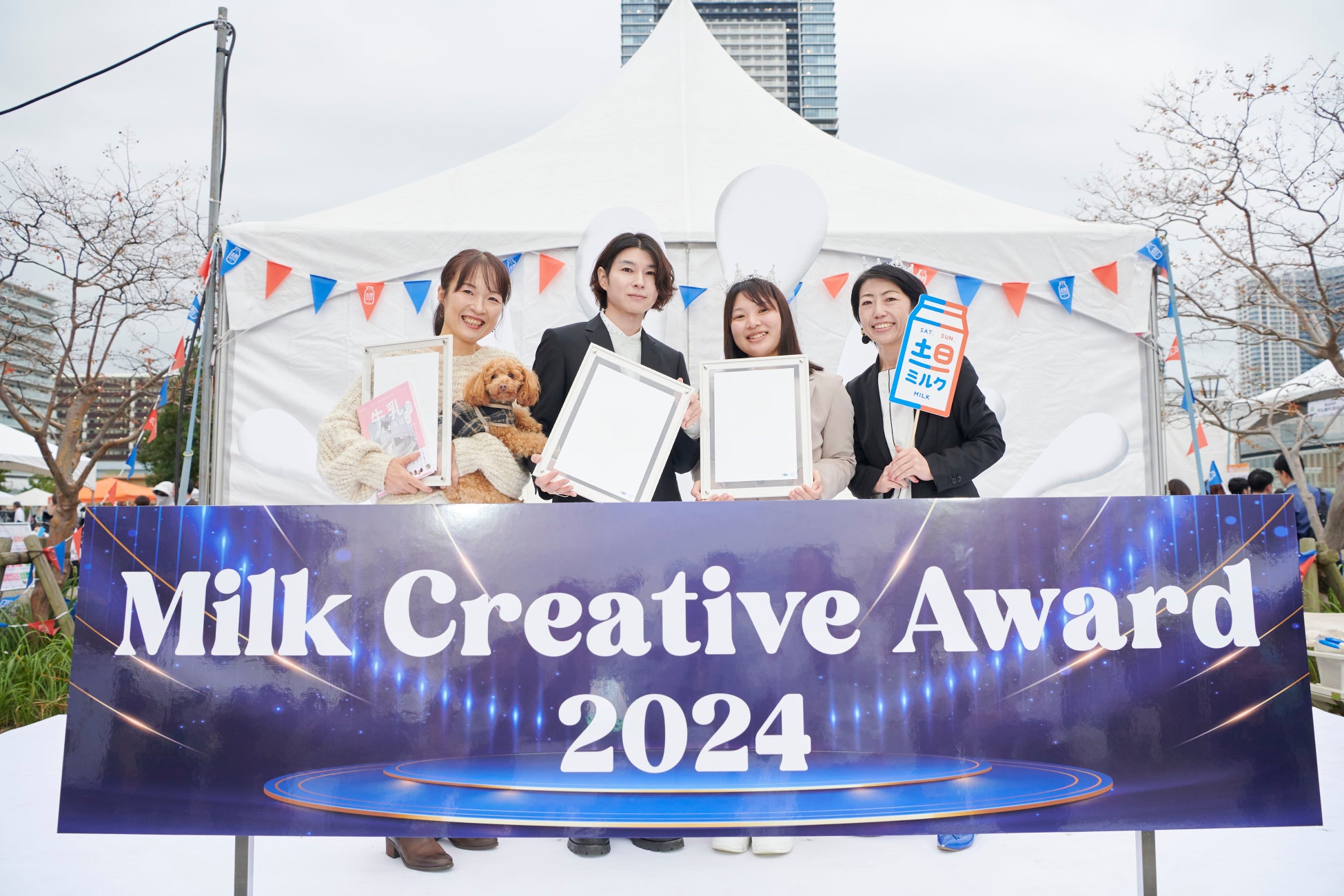 『ワクワク・ゴクゴク・パクパク 土日ミルクフェス2024』内で行われた授賞式には、「飲む・食べる」部門で優秀賞を受賞したBonちゃん先生こと小松友子さん、「楽しむ」部門で優秀賞を受賞した辻尾一平さん、みんなのヨーグルトアカデミーを運営する株式会社almaの柳町玲さん、木村優衣さんが出席しました。
