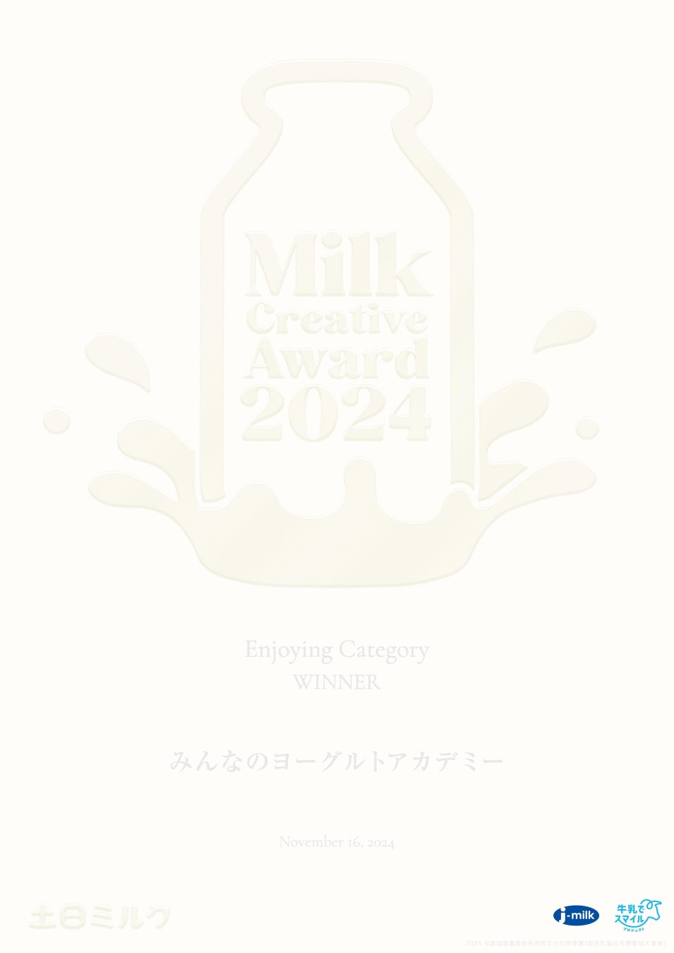 Jミルクは、「学校給食がない日も牛乳を飲もう」をテーマに、小中学生の子どもとその保護者を主な対象として取り組む「土日ミルク」の一環として、牛乳・乳製品の新しい楽しみ方をより多くの方に知っていただくため、1000人以上の酪農乳業関係者やミルクファンによる投票で「Milk Creative Award by 土日ミルク」を実施しました。2024年11月16日(土)に最優秀賞を決定し、東京・豊洲で開催し約3万人が来場した『ワクワク・ゴクゴク・パクパク 土日ミルクフェス2024』で発表いたしました。