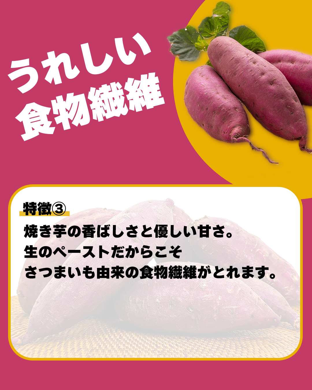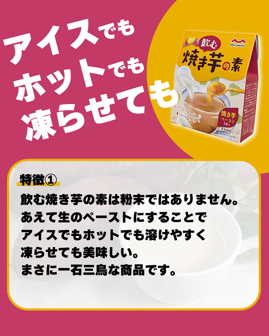 「飲む焼き芋の素」は、牛乳と混ぜるだけで、簡単に”焼き芋ラテ”を作れます。あえて粉末ではなく、本物の焼き芋ペーストを使用しているため、焼き芋の香ばしさや優しい甘みを実現しており、食物繊維を取ることもできます。自然な甘さのため、老若男女問わず、アイスでもホットでも凍らせてもお楽しみいただける商品です。