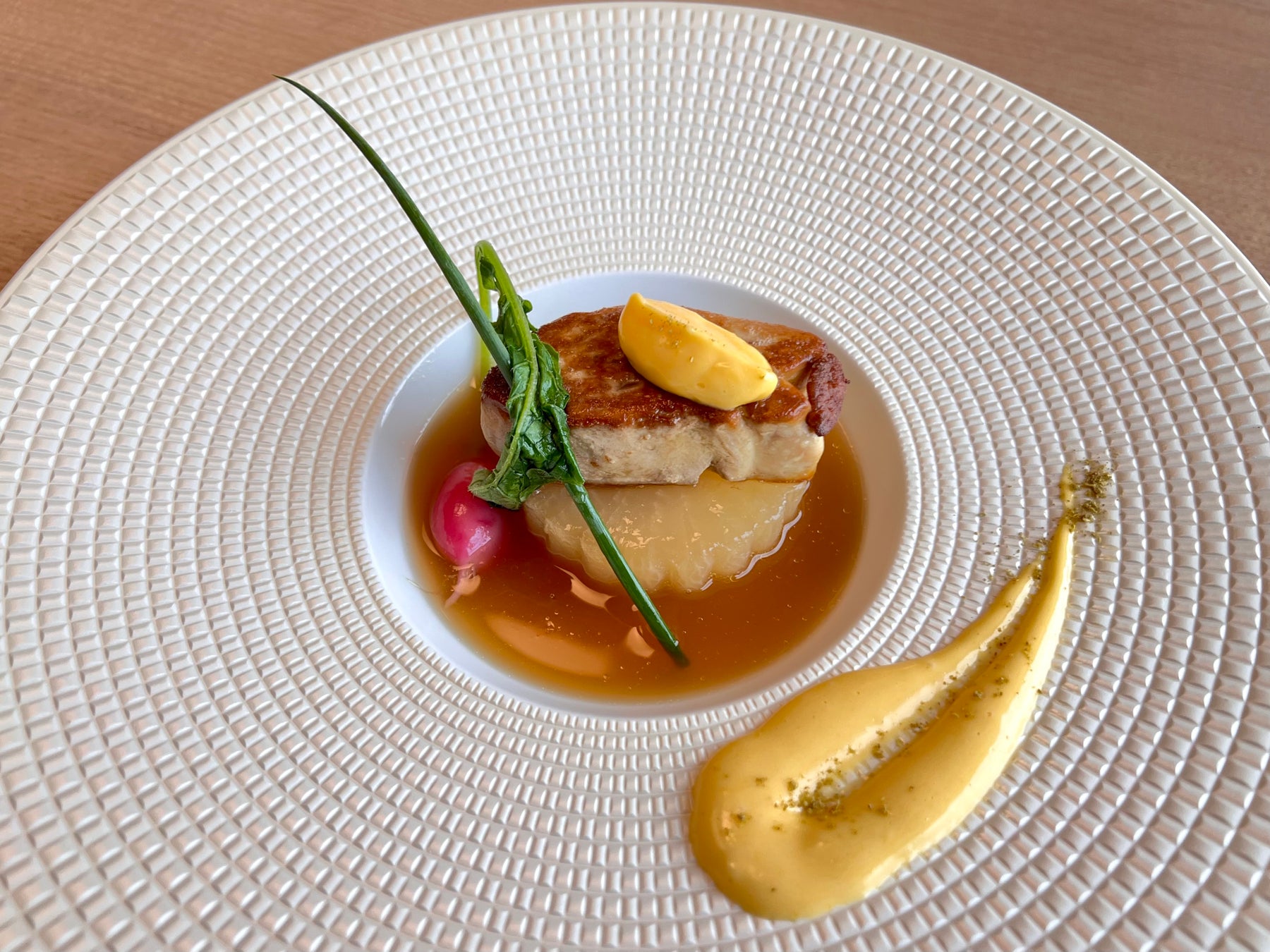 (写真:三嶋大根とフォアグラのソテー ポトフ仕立て山椒の香るヴェアルネーズソースを添えて)富士山三島東急ホテル 炉端グリル炉L’EAU
