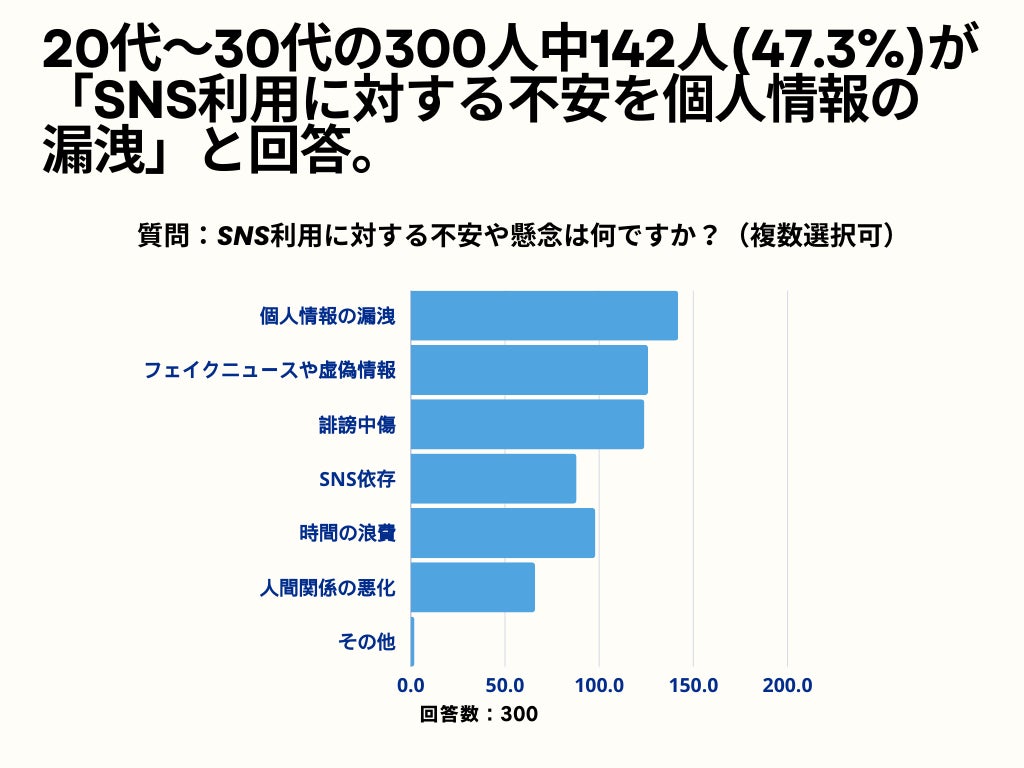 20~30代300人を対象とした「SNS利用に対する不安や懸念は何ですか?」というアンケートで、142人(47.3%)が「SNS利用に対する不安を個人情報の漏洩に不安を覚える」という結果になりました。