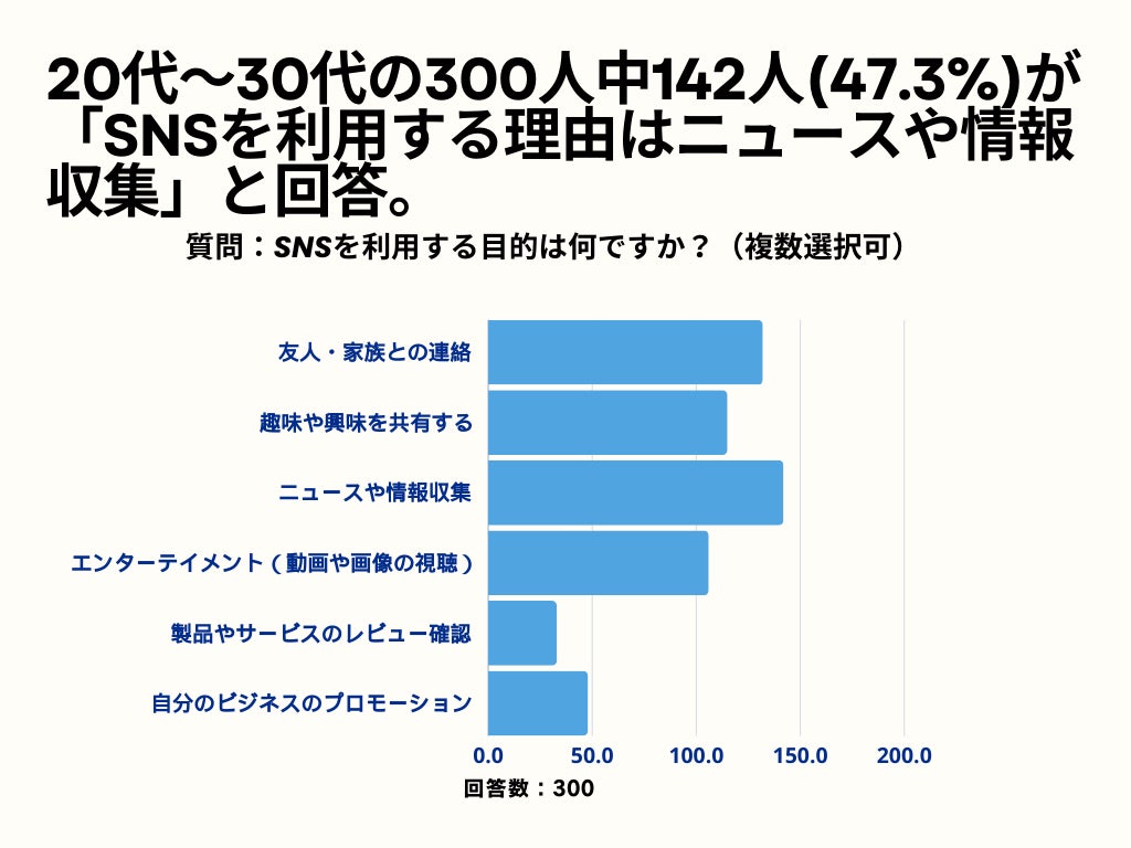 20~30代300人を対象とした「SNSを利用する目的は何ですか?」というアンケートで、142人(47.3%)が「SNSを利用する理由はニュースや情報収集」という結果になりました。