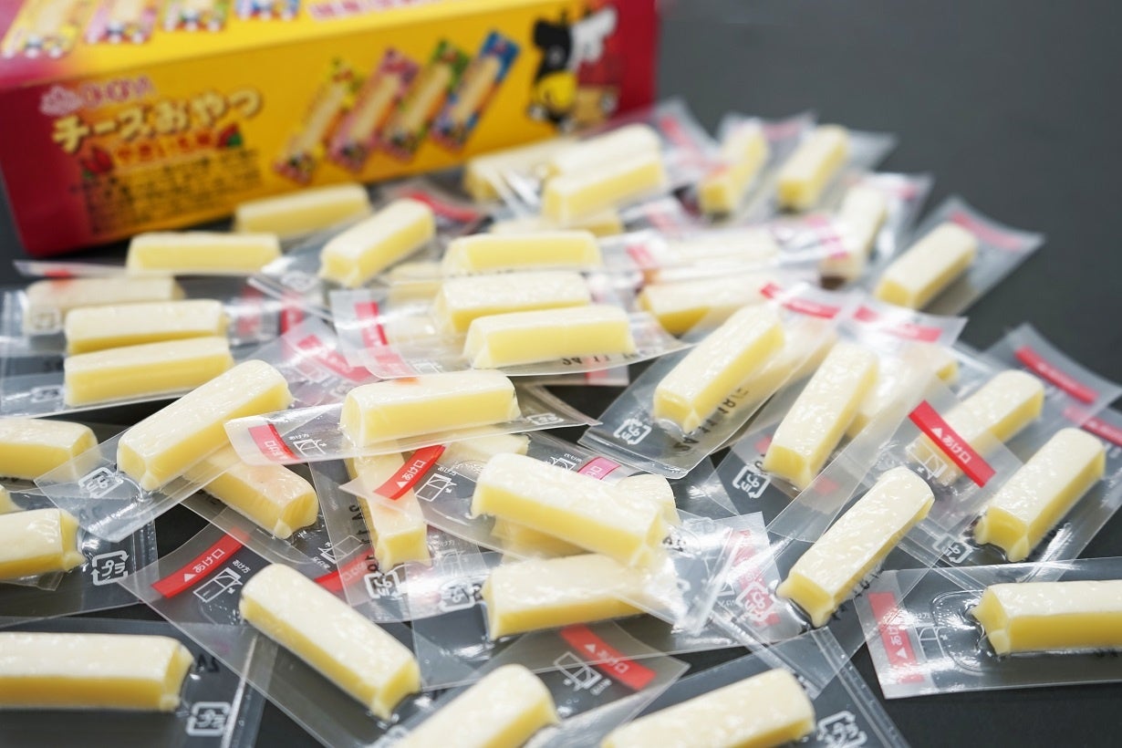 安納芋の風味をより強く感じさせるには、鱈すり身の魚肉の風味が少し邪魔になってしまい、芋の感覚を強くさせることができないか試行錯誤を繰り返しました。そこで、鱈すり身のシートに特別な味付けを行うことで、より芋の感覚が増して味を堪能できるようになりました。味付けに使うフレーバーは様々な種類で試作を行い、複数いる芋好きの社員全員が「コレ!」という調味に1年近くかけてたどり着きました。チーズ加工品は、脱酸素材を使って袋内の酸素を抜くことで常温でも保存することができますが、一度開封すると中身は全部食べ切らないといけません。そのままにしておくと食感が変わったり、カビが生えたりしてしまうためです。チーズおやつは、一口サイズのチーズを“ひとつずつ”真空パックすることで、チーズの美味しさと風味を損なわず常温保存できるようにしました。