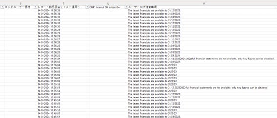 SkyMinderでの取得可能決算期の事前確認結果をMicrosoft Excelフォーマットで一括ダウンロードが可能となり、複数の対象企業への事前確認結果を1回の操作でExcelファイルにまとめて出力できる便利な機能です。