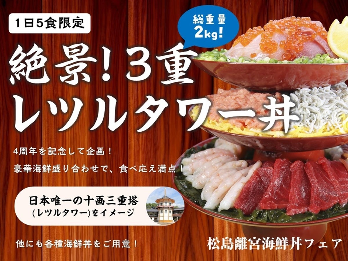 4周年記念企画として、松島離宮庭園に建造されている「日本唯一の十画三重塔(レツルタワー」をイメージした「絶景3重レツルタワー丼」を1日5食限定で販売します。