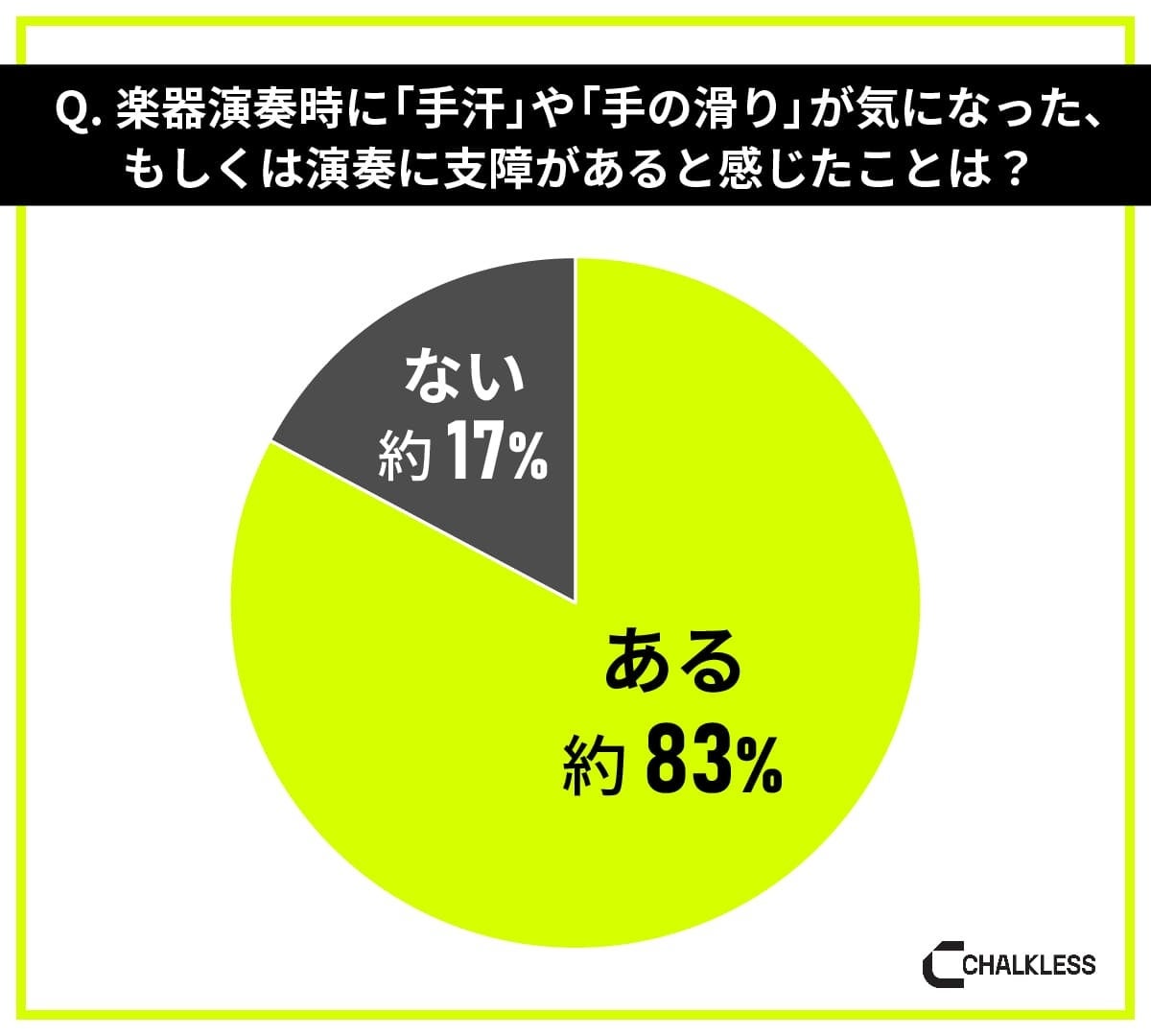 手汗や手の滑りに関して、気になる、もしくは演奏に支障が生じると回答した人は約83%でした。