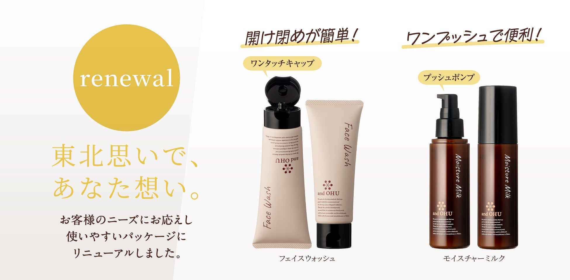 東北6県に391店舗のドラッグストアを展開する株式会社薬王堂(以下 薬王堂)は、「発酵で楽しい社会を!」を掲げる株式会社ファーメンステーションと共同開発したスキンケアシリーズ「and OHU」のパッケージリニューアルをお知らせいたします。お客さまの声にお応えし、内容量と価格はそのままに、フェイスウォッシュとモイスチャーミルクの2種がより使いやすいパッケージへと変わります。