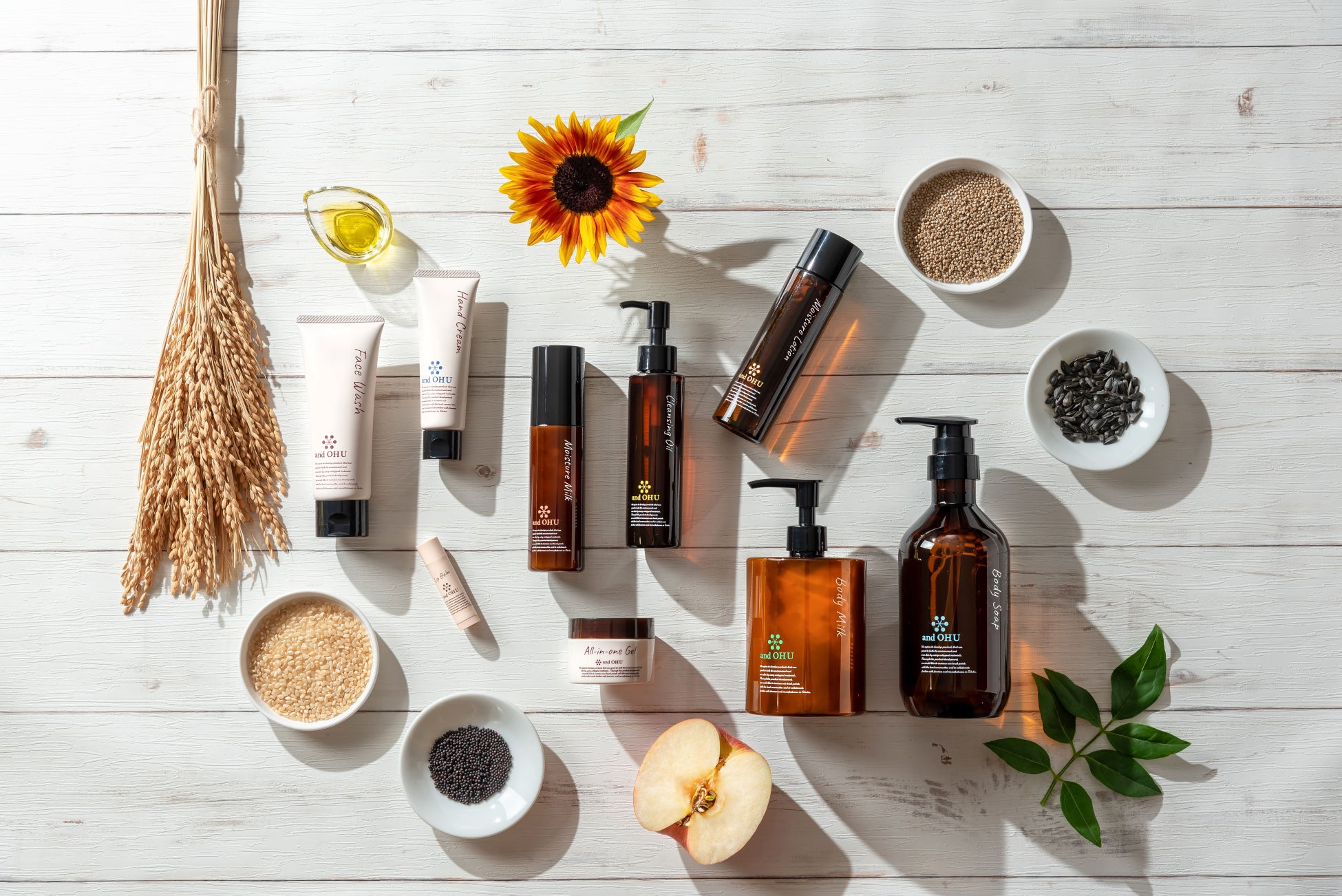 「and OHU(アンオフ)」は薬王堂ホールディングスグループと、岩手県奥州市に製造拠点を持ち独自の発酵技術で未利用資源を再生・循環させる社会を構築する研究開発型スタートアップの株式会社ファーメンステーションが共同開発した、東北の自然素材や副産物などの未利用資源をアップサイクルした素肌と環境にやさしいスキンケアです。