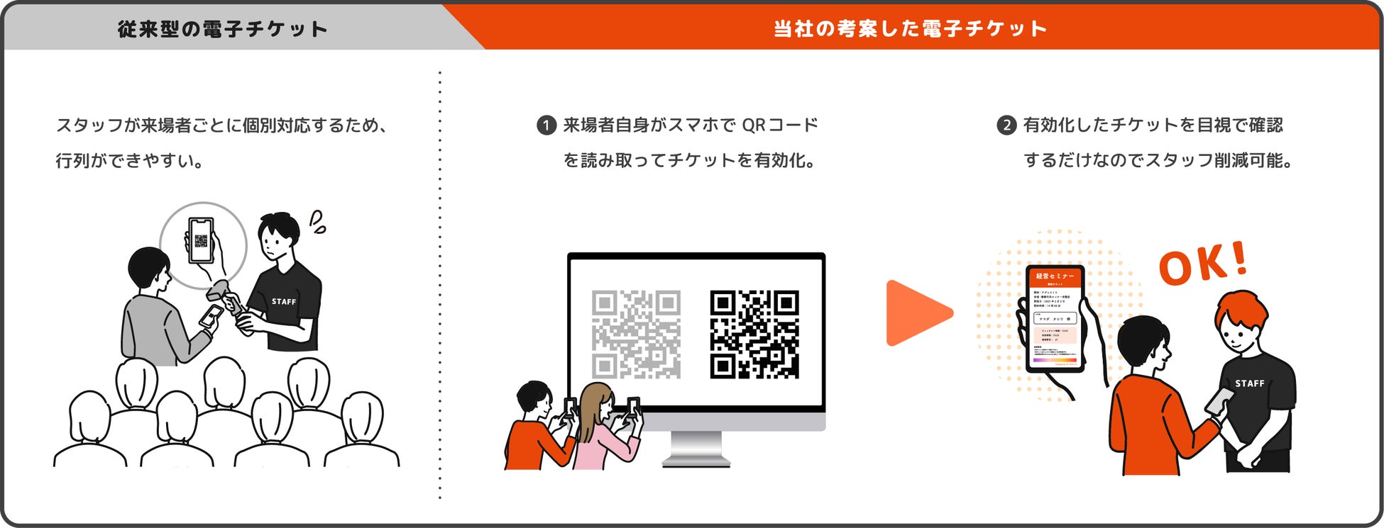 イベント当日、来場者は自身のスマートフォンで、ディスプレイに表示された2つのQRコードのうちどちらか一方を読み取ります。読み取り後、表示されたURLにブラウザでアクセスすると、スマートフォンの画面に電子チケットが表示されます。受付では、その電子チケットを係員に提示することで入場できます。