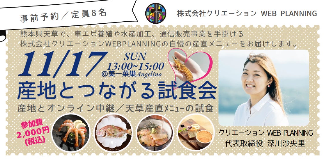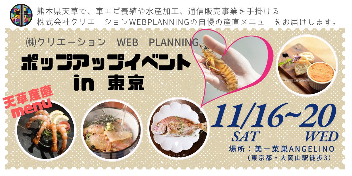 車エビ養殖を軸にEC、卸、加工等多角的に事業展開をする株式会社クリエーション WEB PLANNING(本社:熊本県天草市、代表:深川沙央里、以下CWP)は11月16日(土)~20日(水)の期間限定で、自然派飲食店の「美ー菜巣Angelino(びーなす あんじぇりの)」(東京都、代表:小澤紀子)で、ポップアップイベントを開催します。