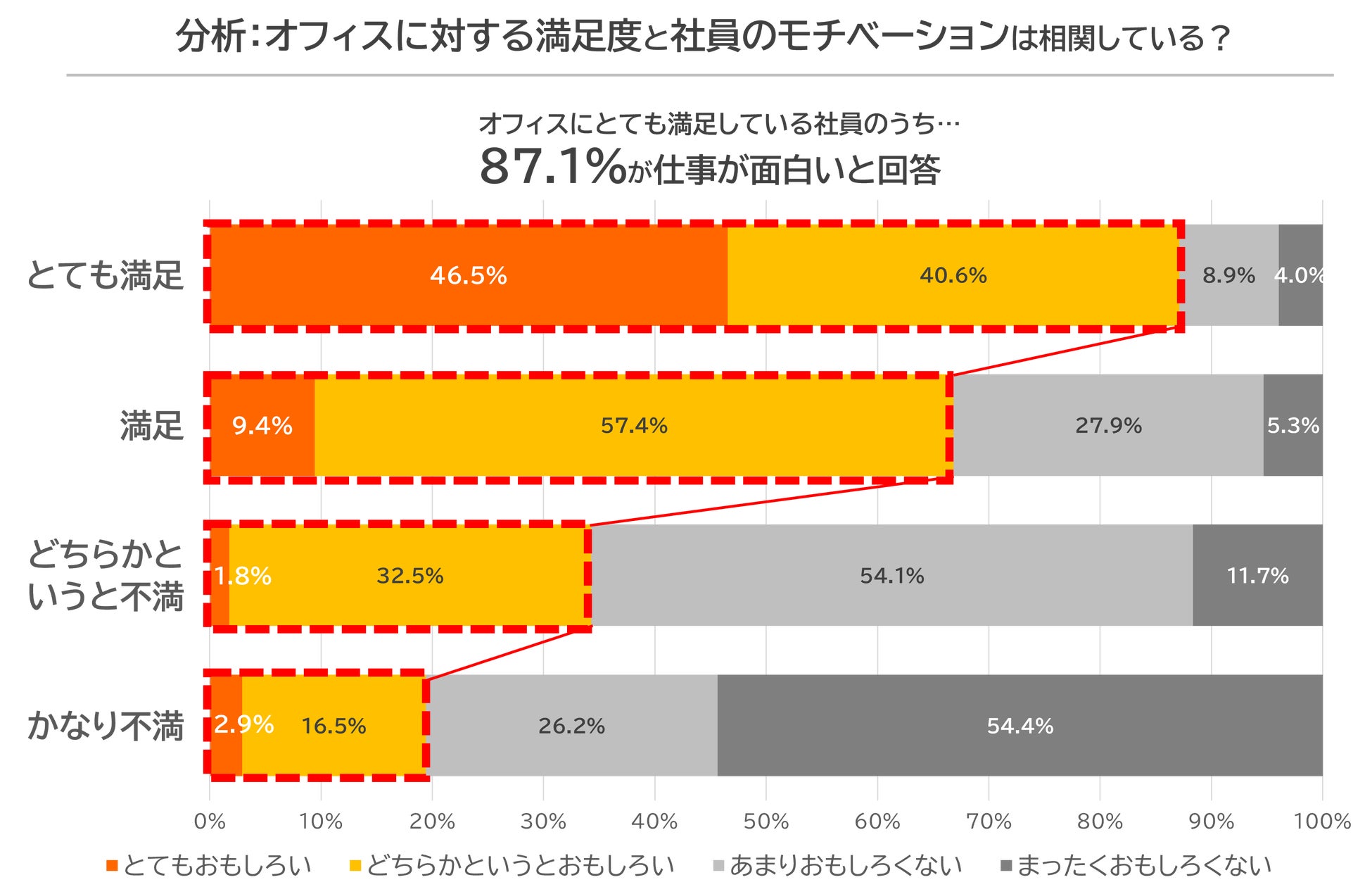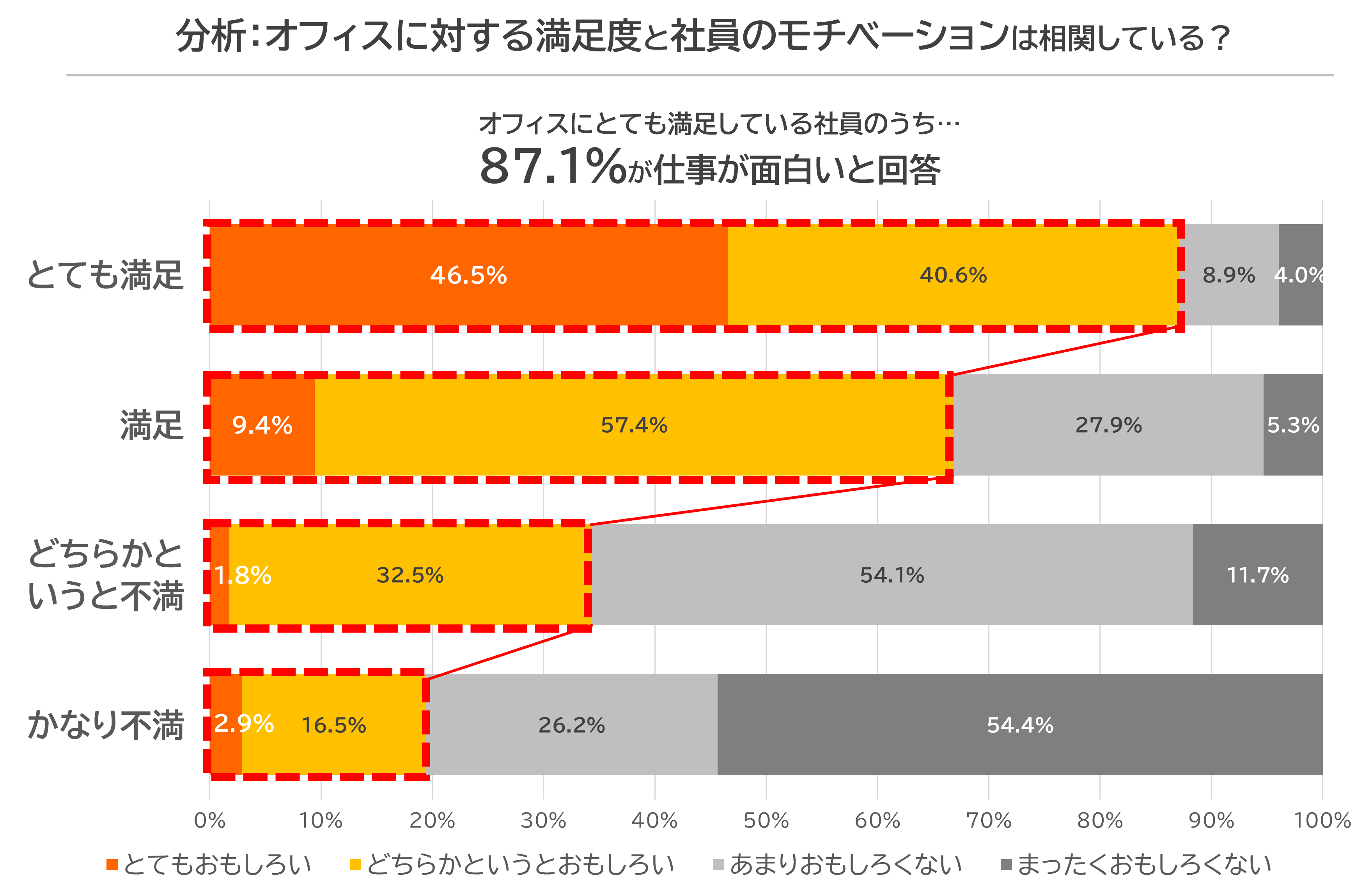 ・オフィス環境に対して「とても満足している」と回答した人の87.1%が「仕事がおもしろい、仕事へのモチベーションが高い」と回答。逆に「かなり不満」と回答した社員だと19.4%と、オフィス環境に関する満足度によって仕事に対するモチベーションに4倍以上の差が生まれた。