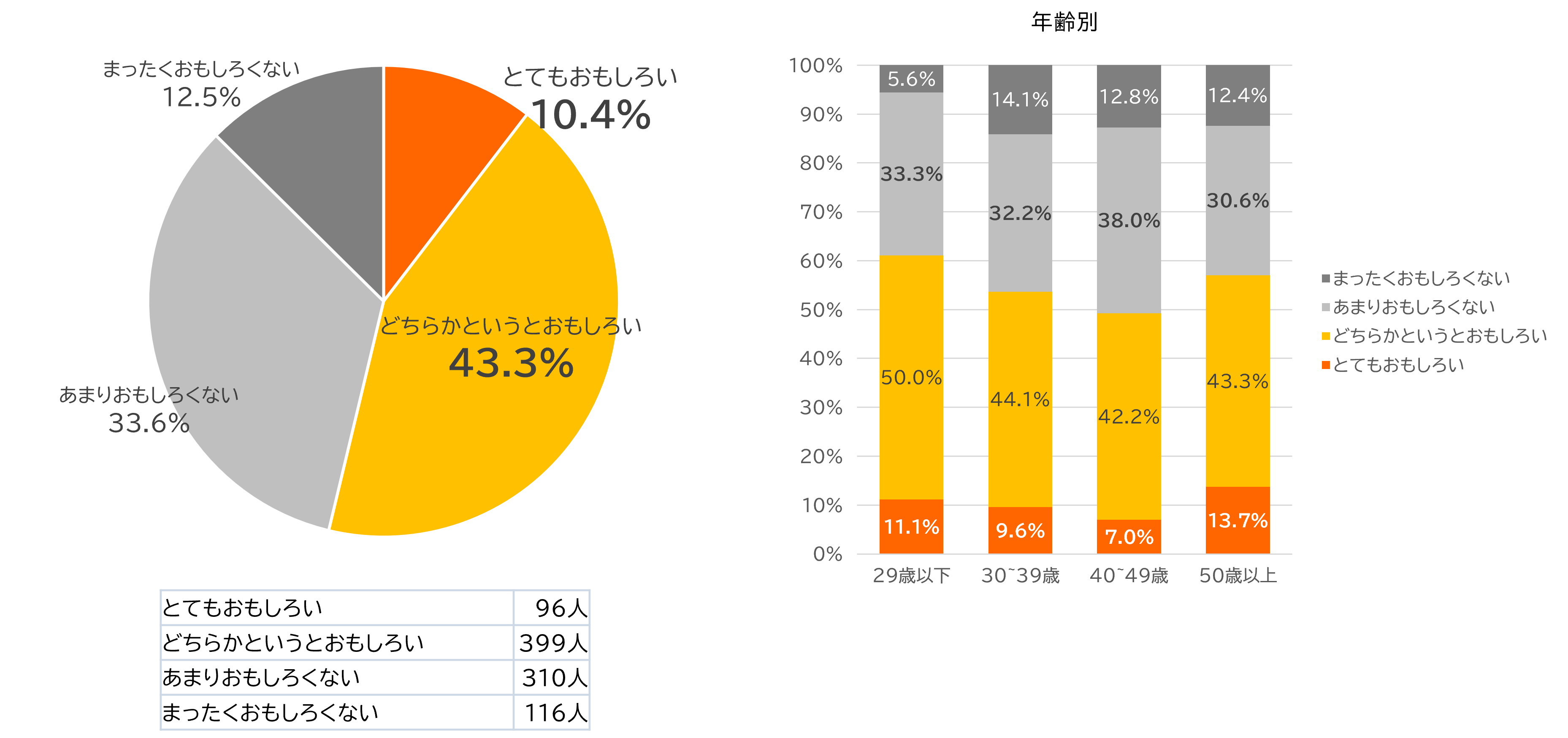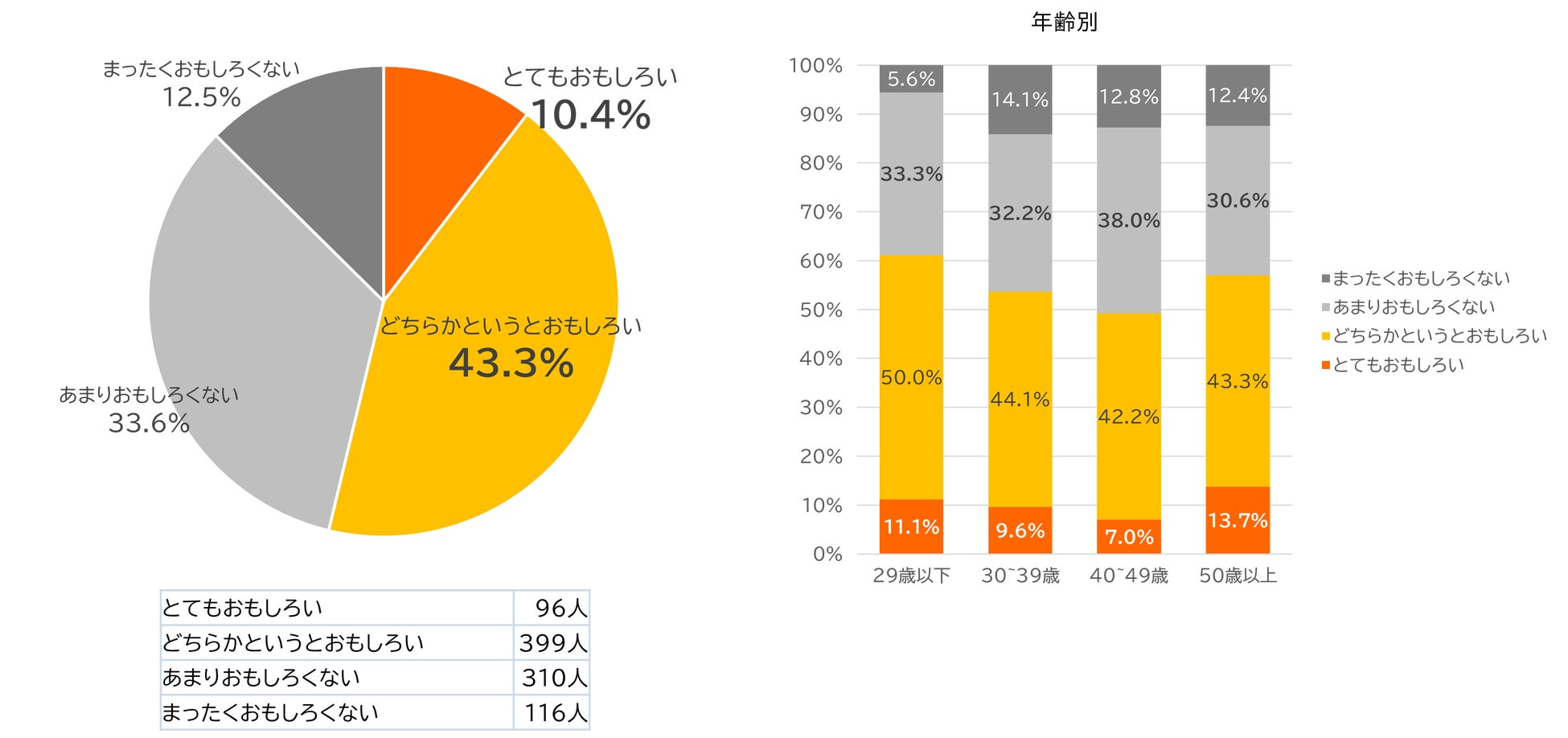 まず働くモチベーションに関してアンケートを実施しました。約半数の53.4%がモチベーションが高い(とてもおもしろい・どちらかというとおもしろいを合算)と回答。