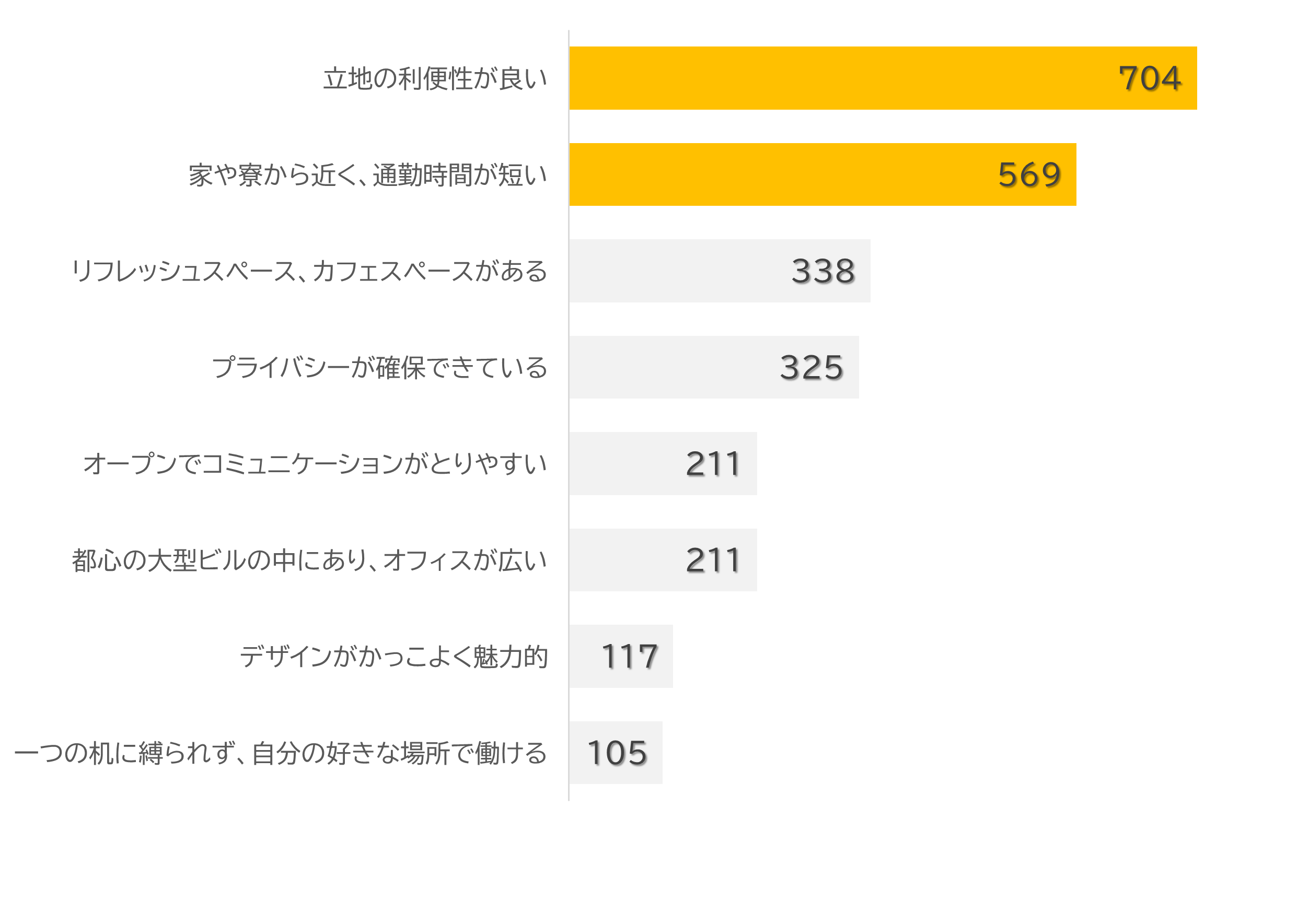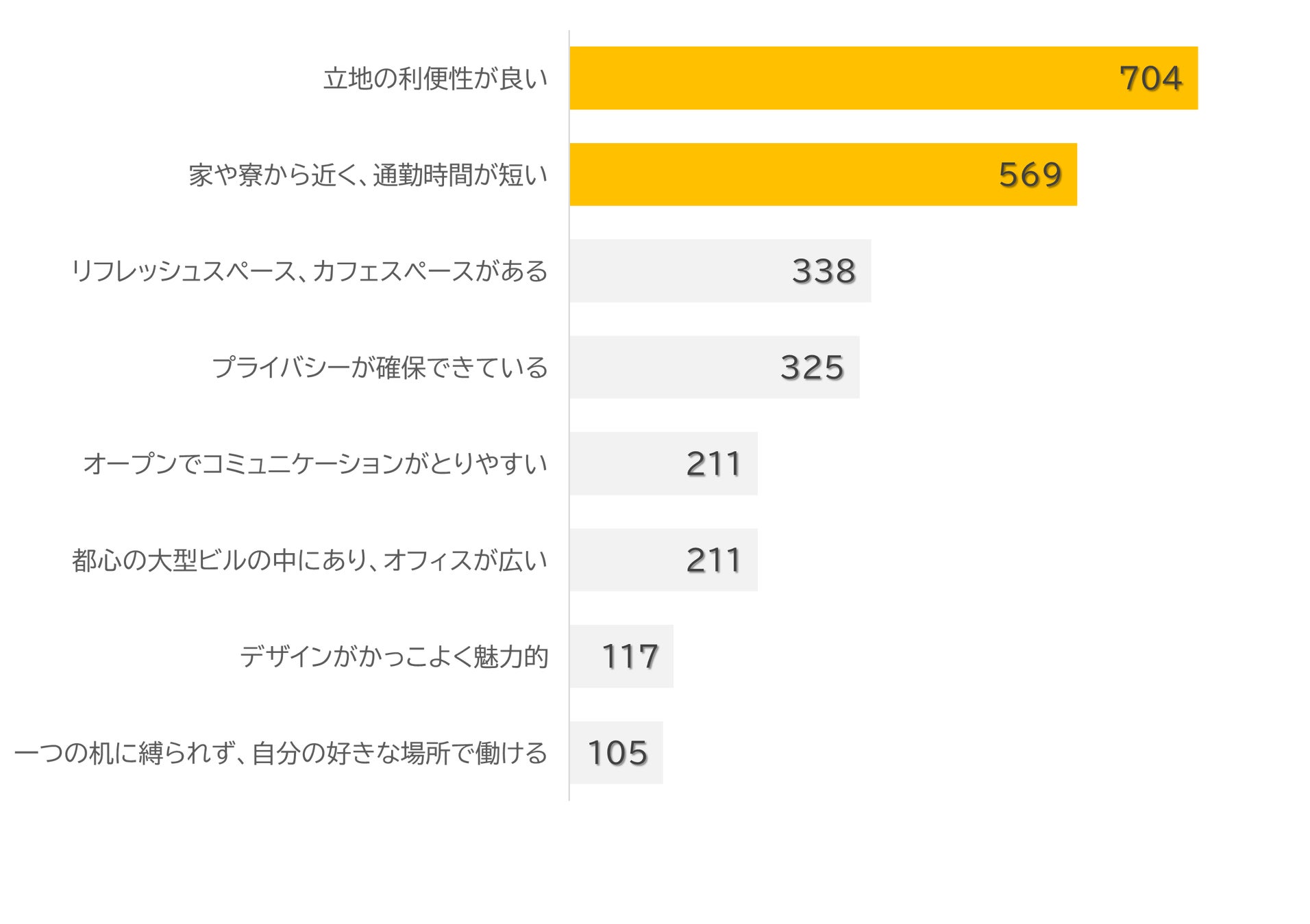 ・どんなオフィスで働きたいと思いますか?の回答に対し「立地の利便性が良い」「家や寮から近く、通勤時間が短い」が1位、2位となり、設備よりもオフィスの立地に関わる条件が重要視される結果に。