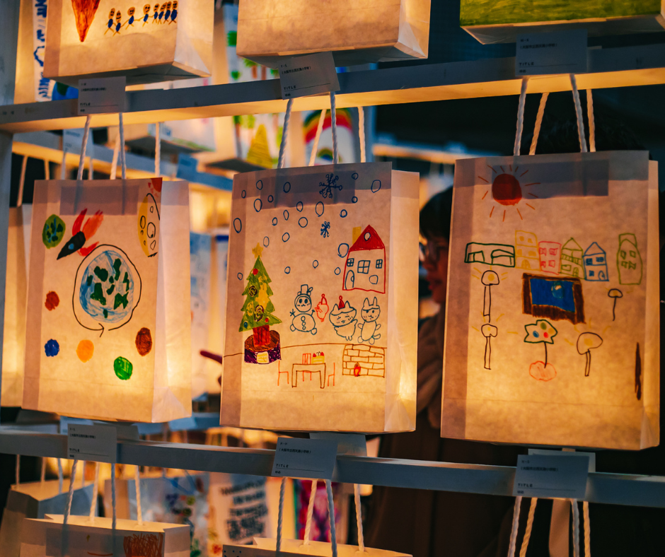 日本古来のあかり「行燈」を、現代らしくオマージュした、西梅田発祥のペーパーバック型の手作りオリジナル行燈。子どもたちに紙袋へさまざまな想いを描いてもらい、展示します。