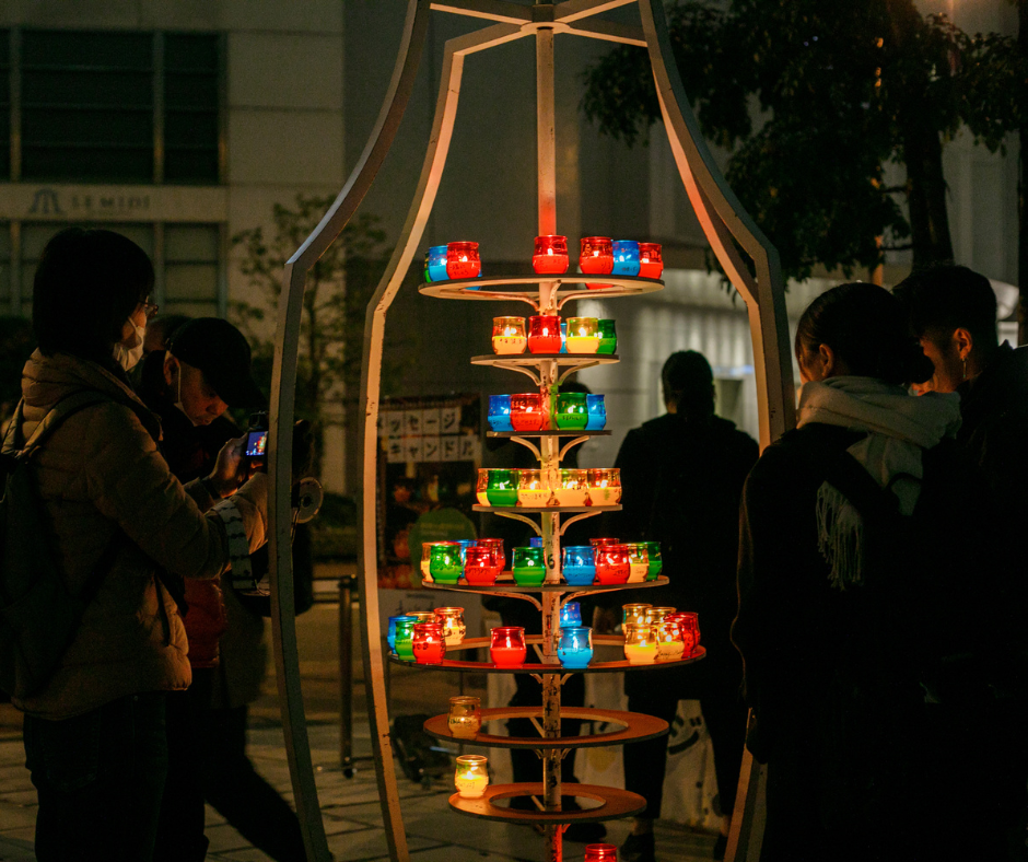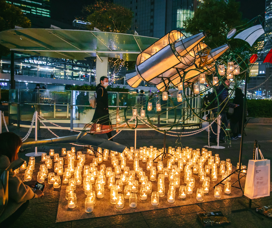 西梅田公園にて、CANDLE JUNE氏によるインスタレーションを展開。プラスチックのキャンドルカップに能登へのメッセージを書いて、インスタレーションに参加できる「想いの灯」を行います。あなたの想いも一緒に灯してみませんか?