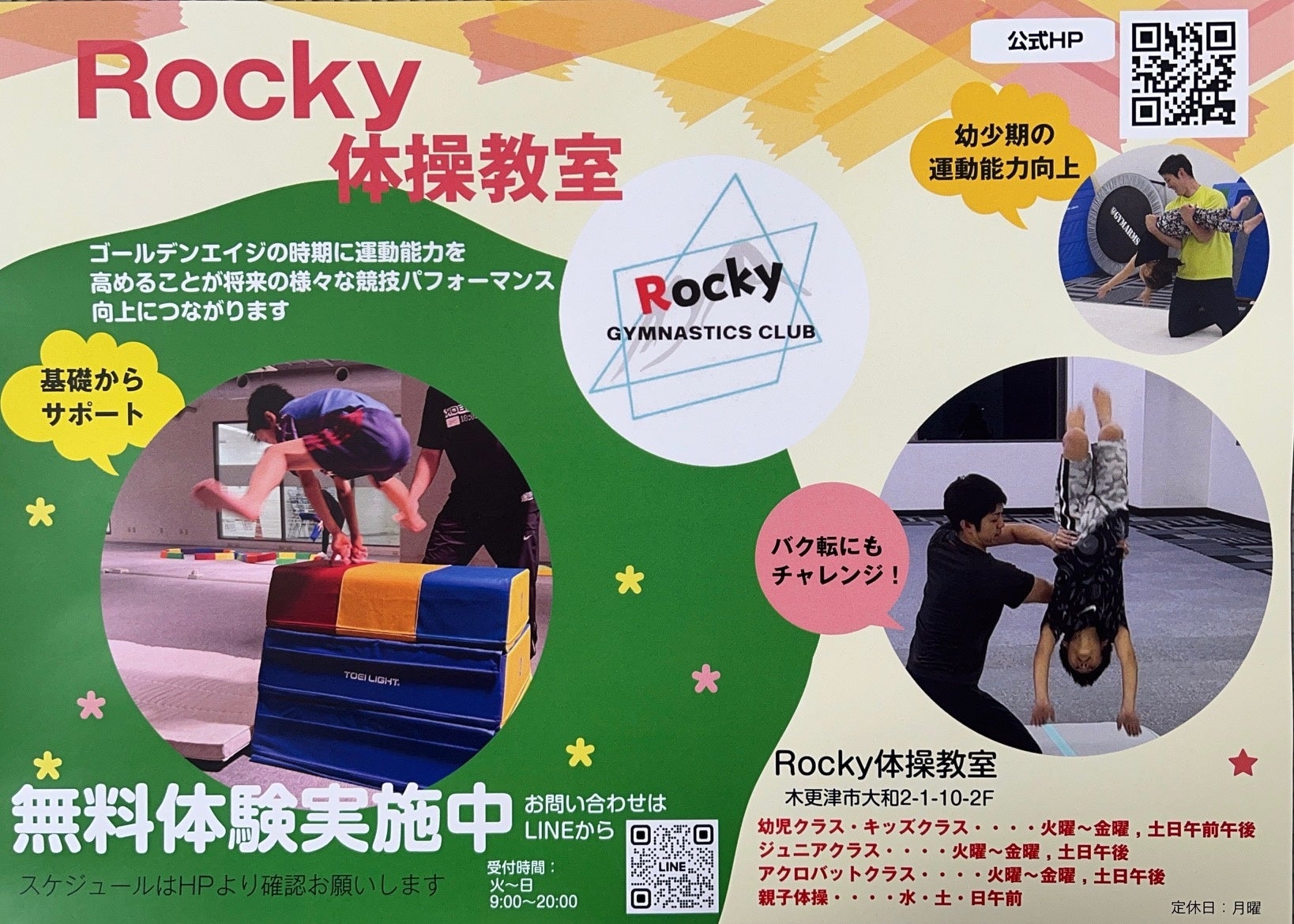 Rocky体操教室(ロッキー体操教室)は、お子様の運動能力、体力の低下、肥満や怪我の増加が問題視されている現状の一助となるべく、ヘッドコーチの岩田の地元周辺の木更津・袖ヶ浦・君津のお子様に向けた体操教室です。