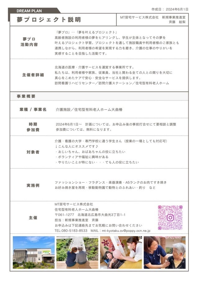 プロジェクトを通して施設職員や利用者様のご家族とも連携しながら、利用者様の希望を実現する力を磨き、介護の仕事のやりがいを実感することを目指した活動です。
