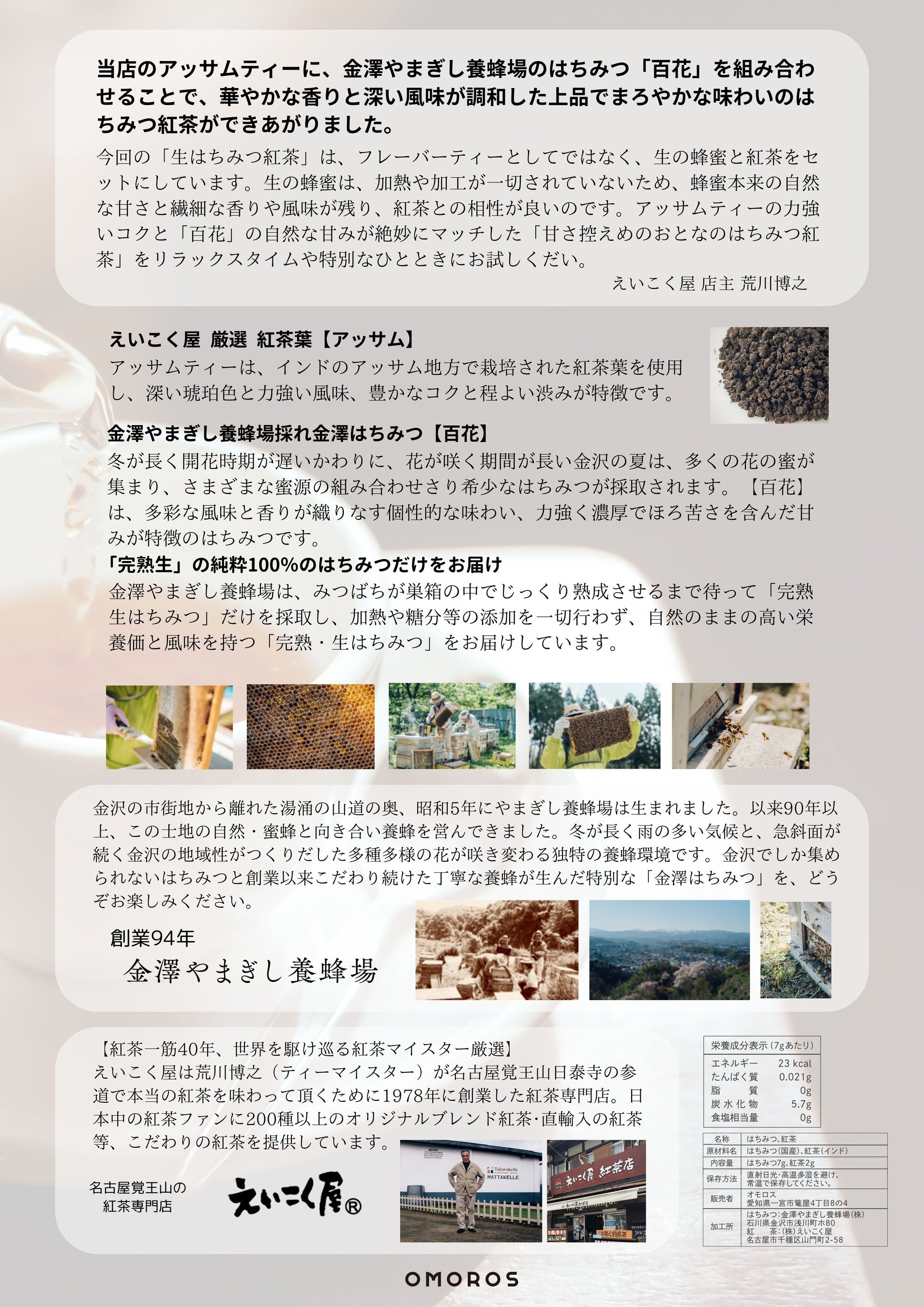 屋号の「オモロス」は「おもしろい」を「する」の意です。自分がおもしろいと思い、かかわった方もおもしろいと思っていただけることが最高のことだと思います。今回は、もともとご縁がありドライフルーツティ―用の紅茶を供給していただいているえいこく屋さんと金澤やまぎし養蜂所さんのご縁をとり持つことができました。また、新たなご縁が元で良い商品ができましたと思っています。今後も、おもしろいの輪が広がるような商品の企画を続けて参ります。 企画・販売 オモロス