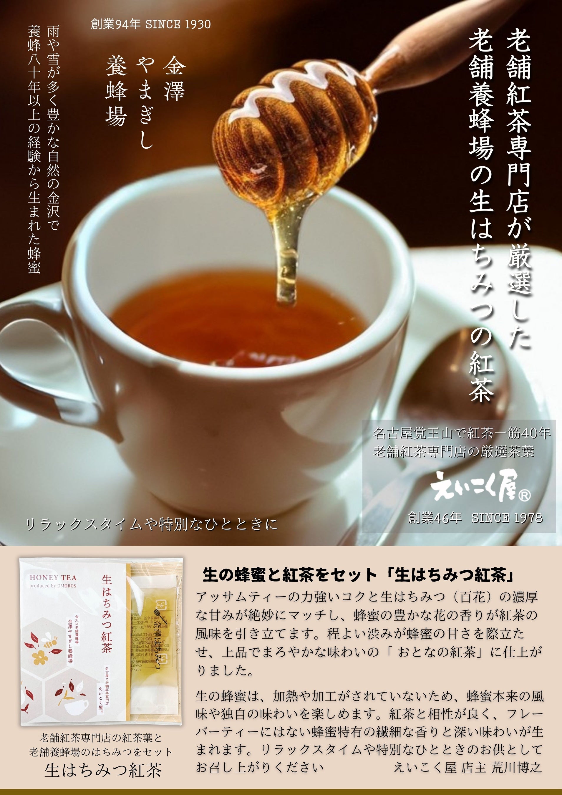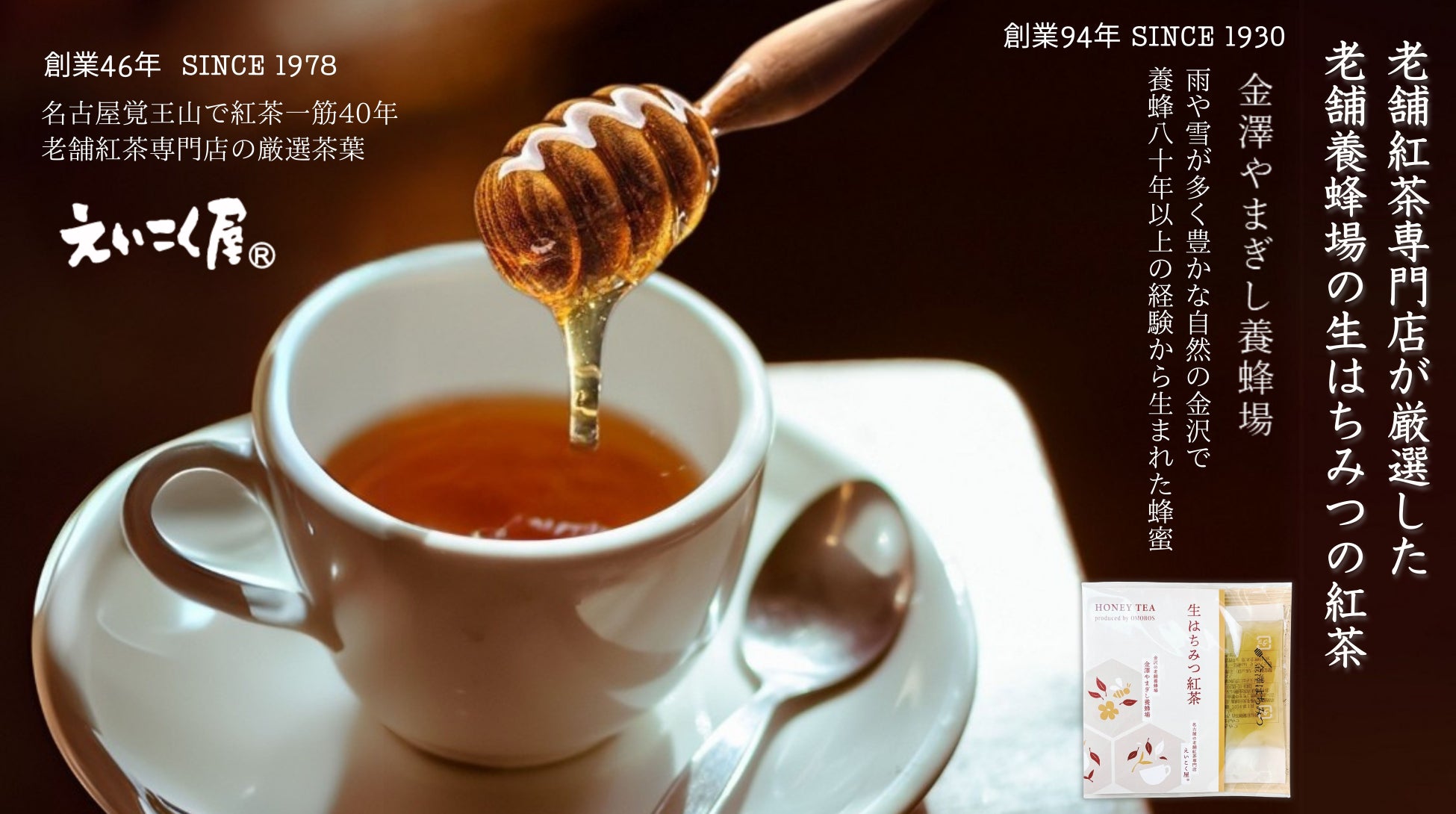 名古屋覚王山の紅茶専門店「えいこく屋」のアッサムティーと金沢の老舗養蜂場 「金澤やまぎし養蜂場」のはちみつ(百花)を使用した「生はちみつ紅茶(紅茶葉とはちみつのセット)」を3月4日新発売