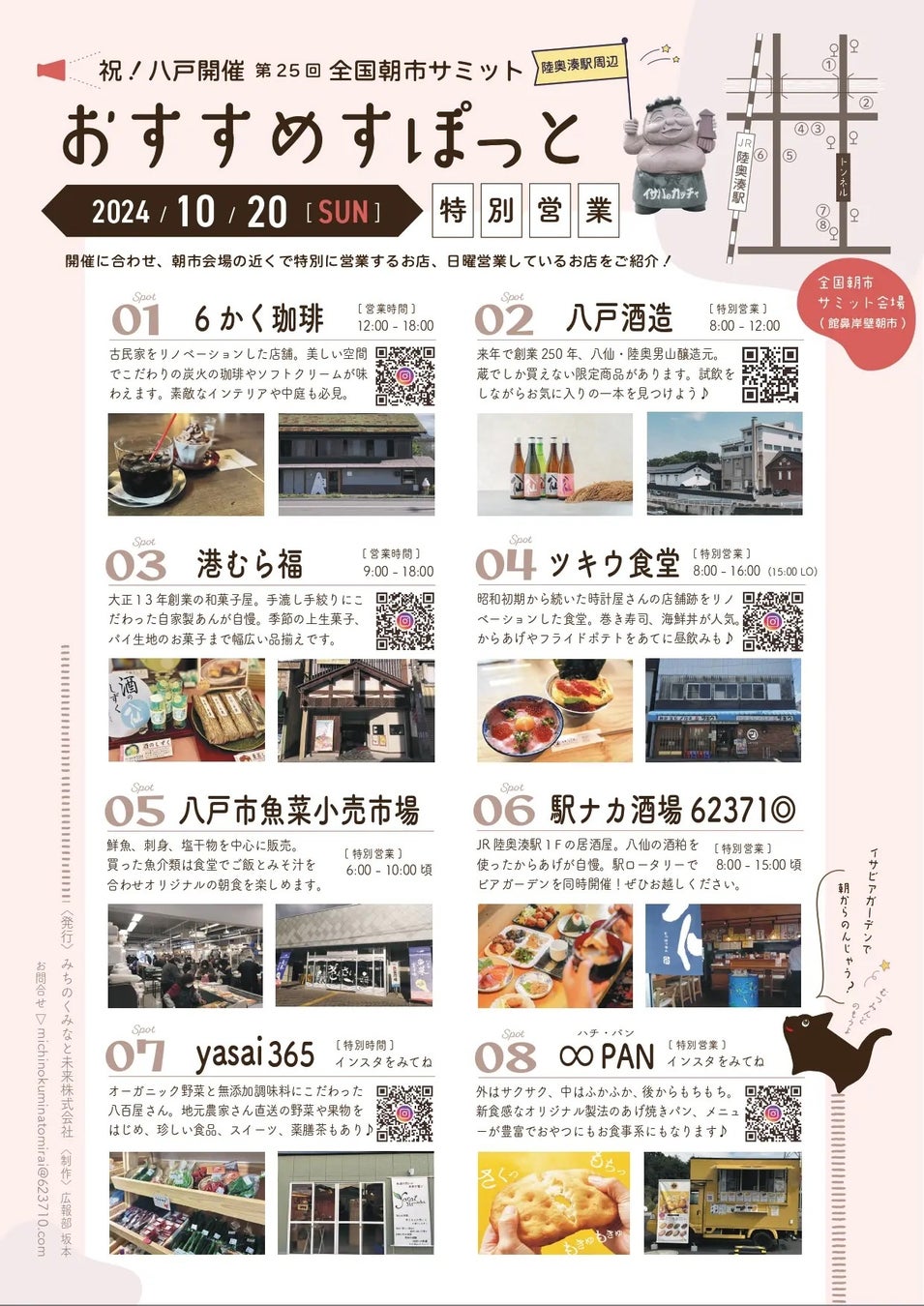全国朝市サミットは1988年から延べ25回目の開催であり、八戸市での開催は2015年に続き2回目となります。また今回は、能登半島地震で被災した輪島朝市(石川県輪島市)の支援も大きなテーマとなっており、集客見込みは前回同市で開催された際を大きく上回る6万人です。