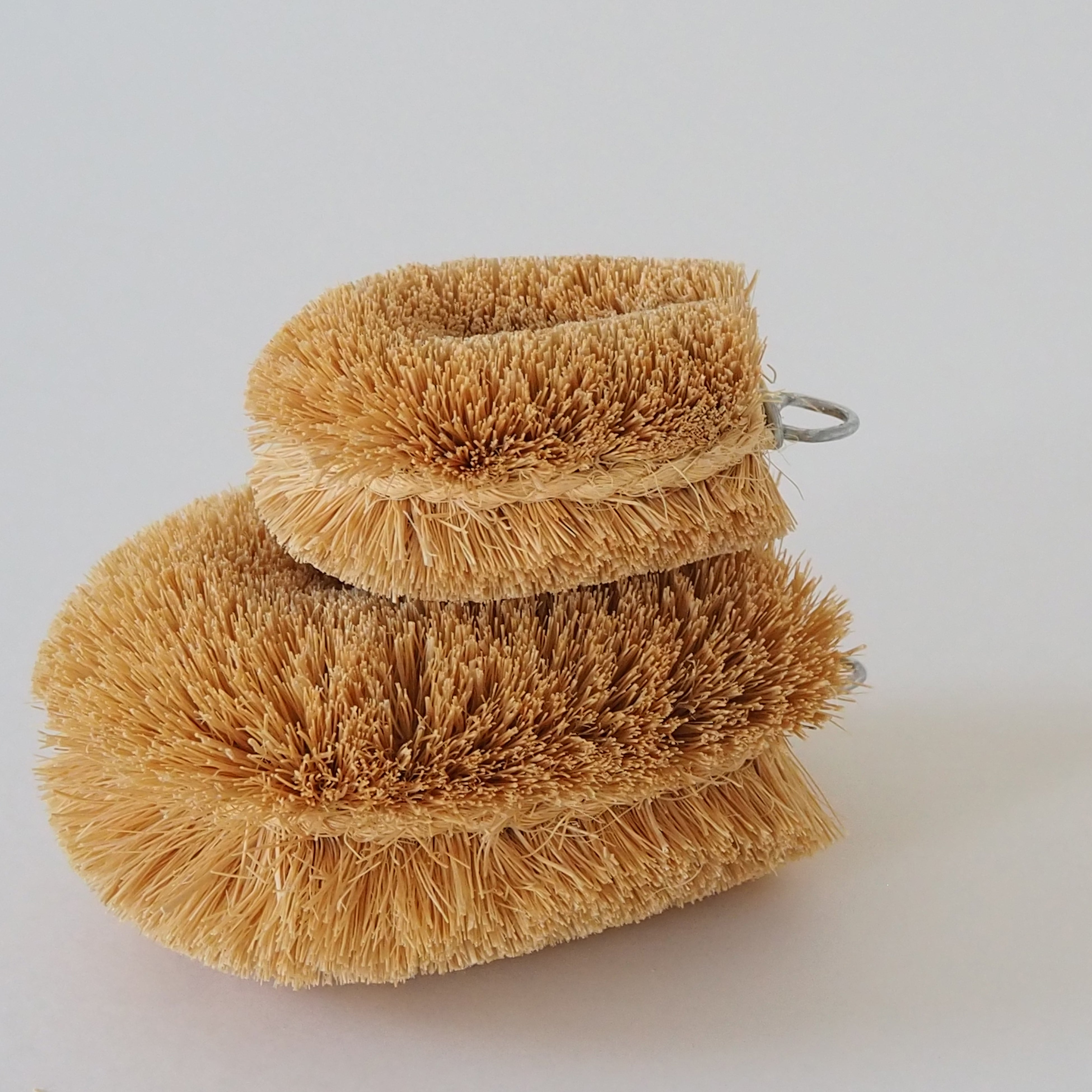 パームたわしの極小サイズで亀の子束子と同じココナッツ繊維を使用した、縄をかけていないたわしです。指先でつまめるとても小さなたわしですが、繊維をしっかり巻いて作ったたわしなので、狭い場所の洗浄や指先のお手入れに使うことができます。