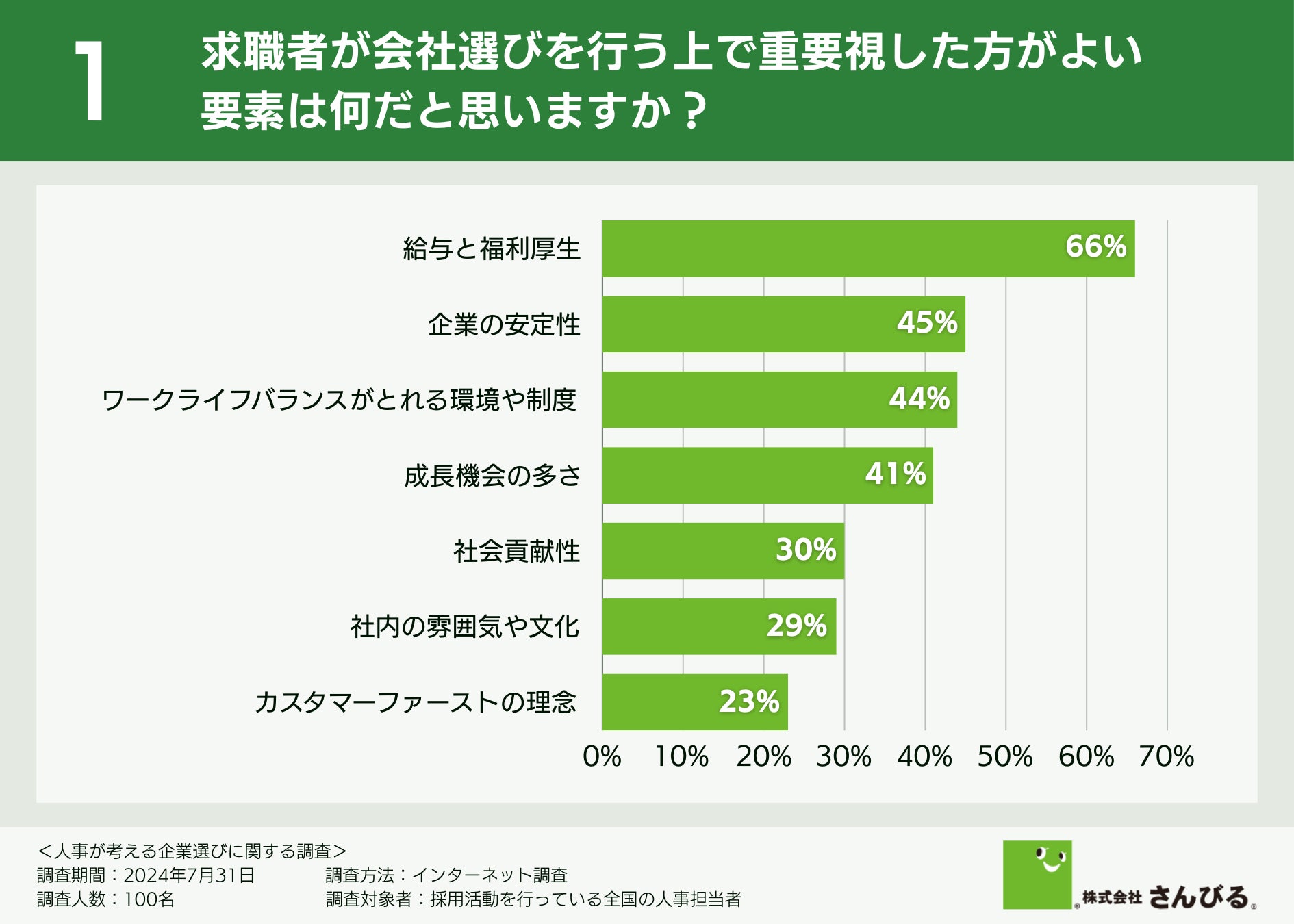 はじめに、求職者が会社選びを行う上で重要視した方がよい要素は何だと思うか伺ったところ、「給与と福利厚生(66.0%)」「企業の安定性(45.0%)」「ワークライフバランスがとれる環境や制度(44.0%)」という回答が集まりました。
