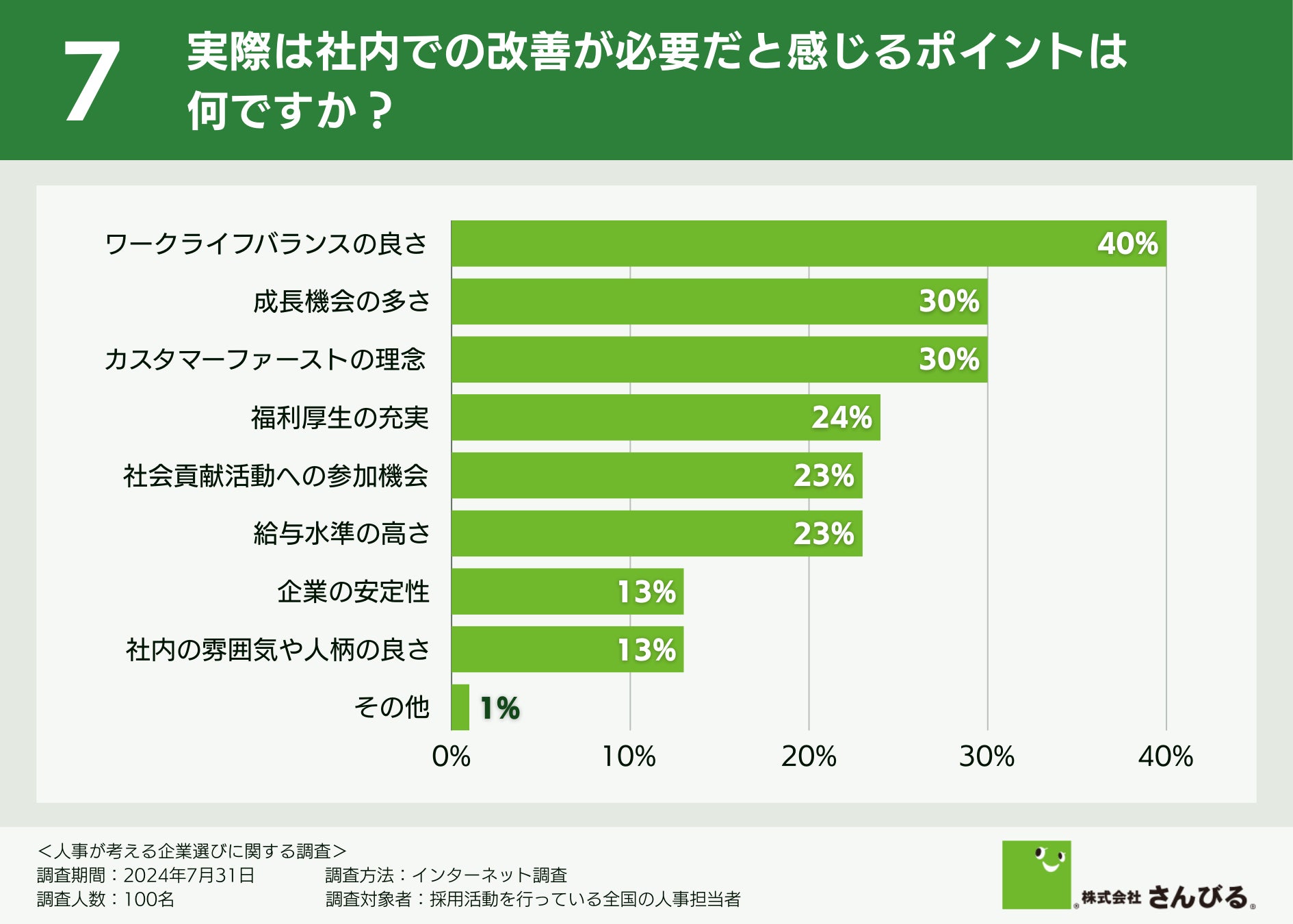 採用活動時にアピールしているポイントが明らかになりましたが、実際は社内での改善が必要だと感じるポイントは何なのか伺ったところ、「ワークライフバランスの良さ(40.0%)」「成長機会の多さ(30.0%)」「カスタマーファーストの理念(30.0%)」という回答が集まりました。