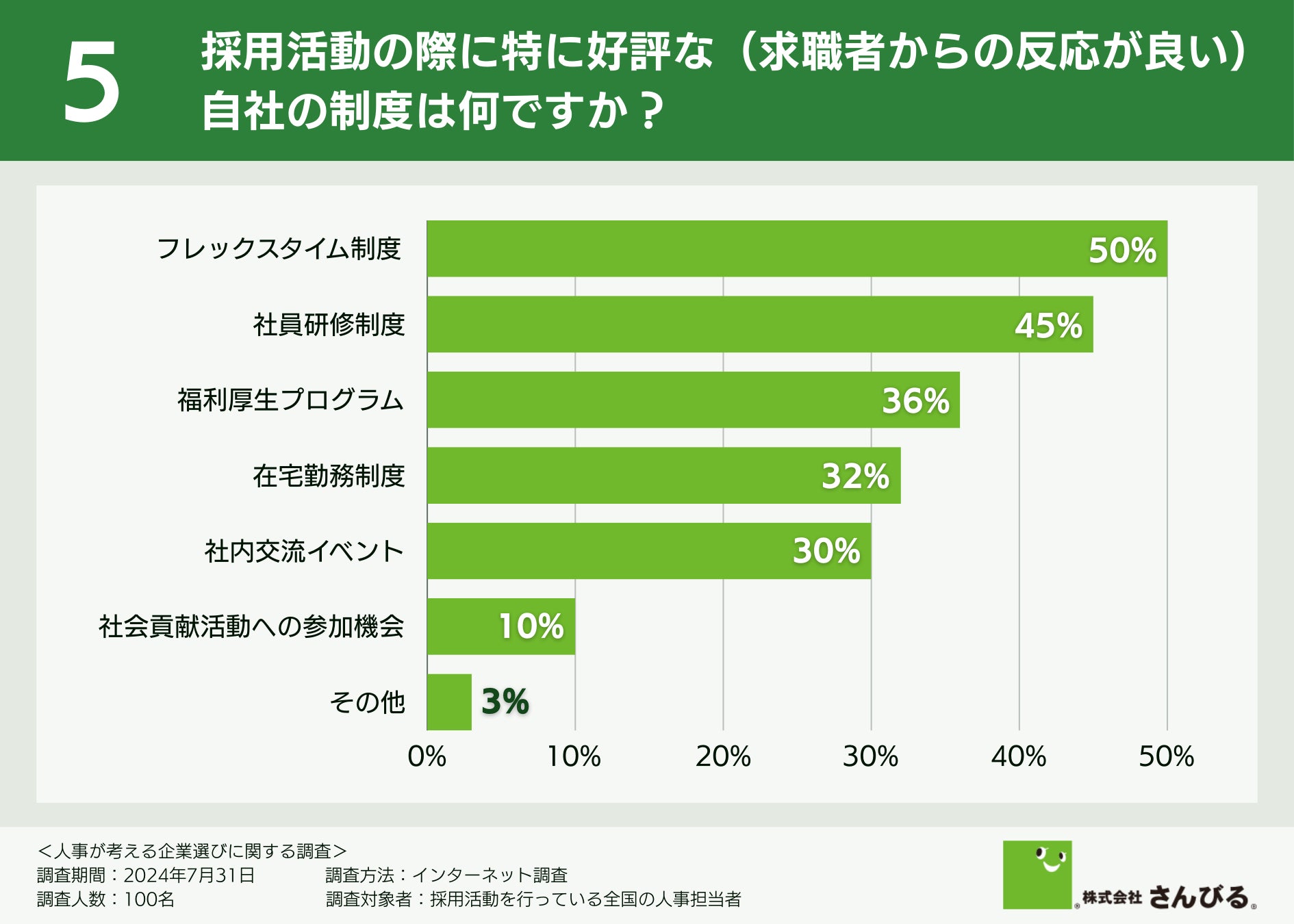 採用活動の際に特に好評な(求職者からの反応が良い)自社の制度について伺ったところ、「フレックスタイム制度(50.0%)」という回答が最も多く集まり、求職者が働き方の自由度の高さを求めている様子が伝わってくる結果となりました。