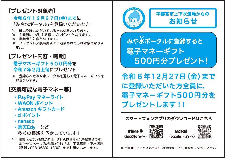 (1)プレゼント対象者:令和6年7月1日から12月27日までに「みや水ポータル」を登録頂いた方