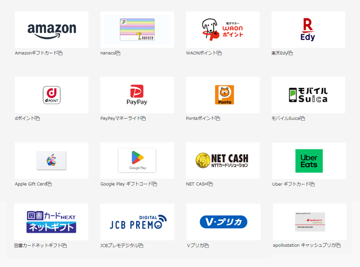 交換可能な電子マネー等:PayPayマネーライト,WAONポイント,Amazonギフトカード,dポイント,nanaco,Pontaポイント,楽天Edy,モバイルSuicaなど16種類から選択