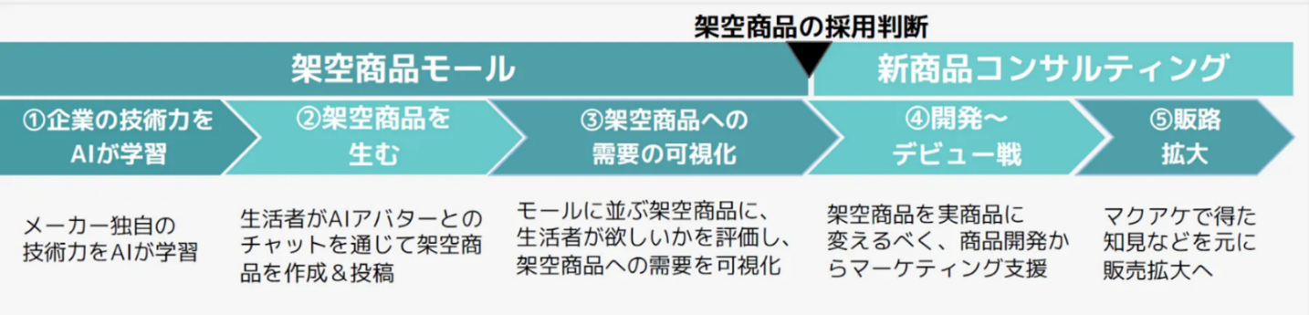 ②「AIがメーカーの技術力と生活者のニーズを組み合わせて独自の商品アイデア(架空商品)を提案する機能」と、「どの架空商品にどれだけの賛同が得られるかを可視化する機能」をもった新商品開発プラットフォーム「架空商品モール」