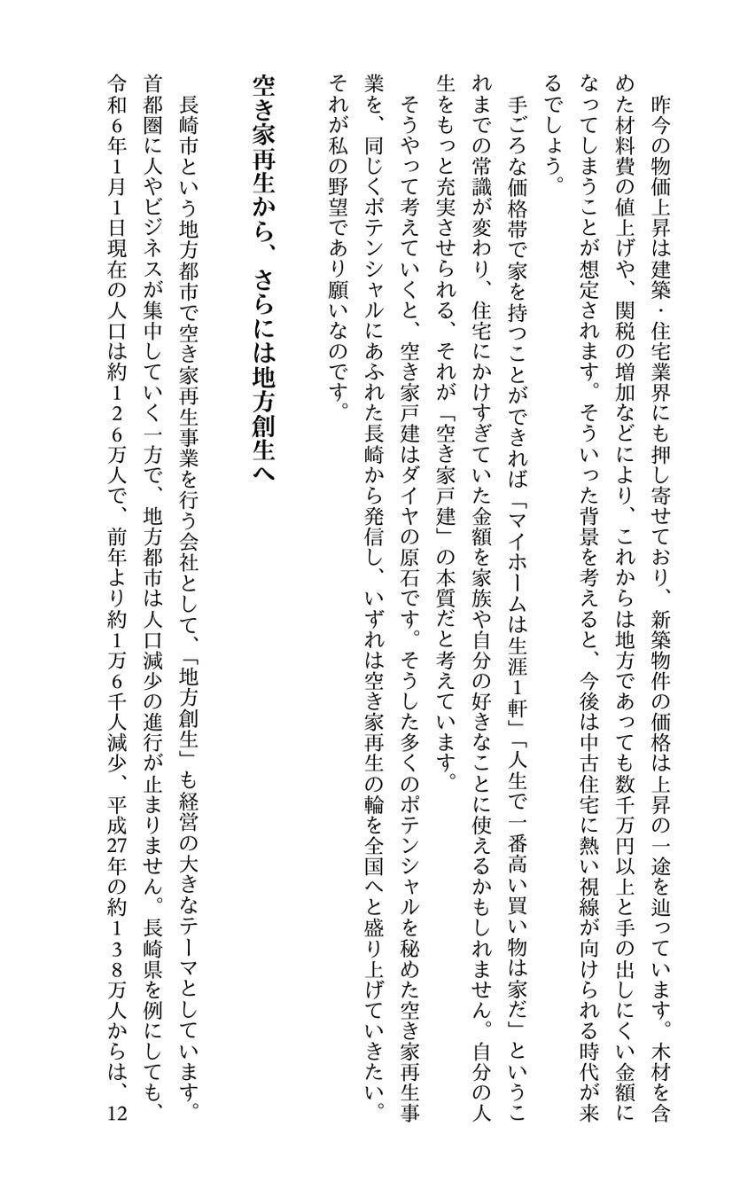 そのような方々に、空き家に関する周辺知識や具体的な活用方法、実際に空き家再生を行った事例などのリアルな情報をお届けしたい。また、私が拠点とする長崎市の空き家事情を通じて、地方都市における空き家活用の可能性についても、もっと多くの方に知っていただきたい。そして、深刻化する空き家問題に少しでも貢献できたら。そうした思いで、筆を取らせていただきました。
