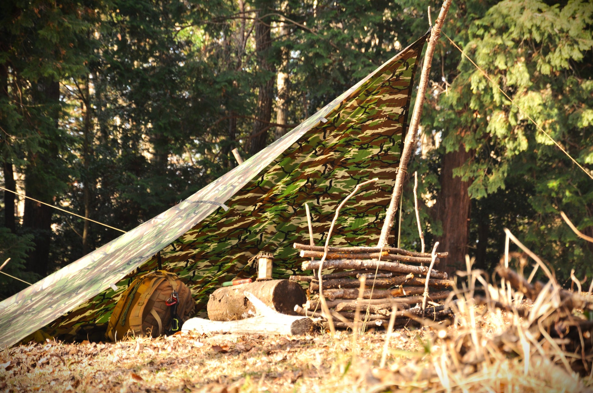 【正午】古道を抜けた先の森でビバーク(緊急避難的なキャンプ)を想定したデイキャンプ&ランチに挑戦。素早く役割分担して拠点をつくり、火をおこしてお湯を沸かしたら、温かい昼食の時間です。