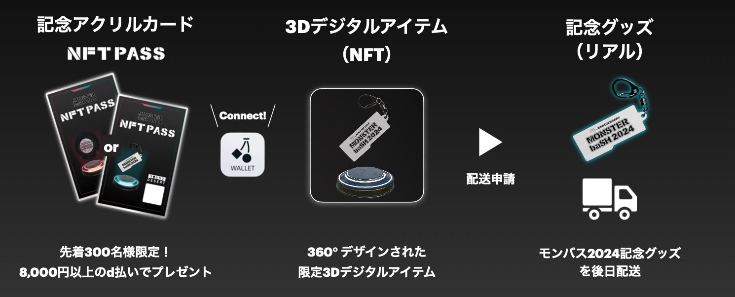 NTTドコモグループ※1の新規事業創出プログラム「docomo STARTUP™」を通じてスピンアウトした株式会社CrossVision(本社:東京都千代田区、代表取締役:奥井 颯平、以下、クロスビジョン)は、株式会社NTTドコモ四国支社(以下、ドコモ四国)、株式会社NTT Digtal(以下、NTT Digital)と連携し、2024年8月24日(土)、25日(日)に香川県で行われる中四国最大級の野外フェス『MONSTER baSH 2024』(以下、モンバス)にて、モンバス25周年記念限定NFTを提供します。