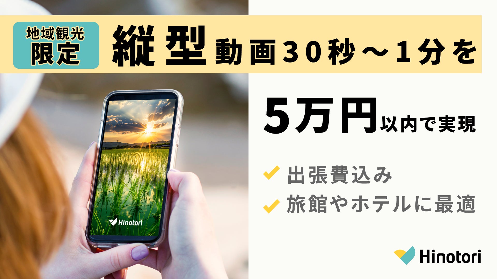 地域観光と旅館向けスタートアップ株式会社Hinotori(本社:東京都渋谷区、代表取締役社長:大﨑庸平)が、7月17日より地方旅館・ホテル、観光地向けの新サービス「"地方特化"縦型動画お手軽プラン」を提供開始します。お手軽に30秒~1分動画が納品され、素材動画もご提供するので日々のリール動画やTiktokなどの運用に最適です。