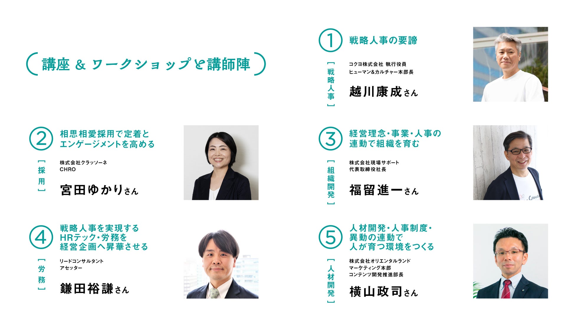 実際に戦略人事を組織で推進している経営者・人事責任者を講師に招き、リアルな経験をもとに学ぶ講義を全5回実施。
