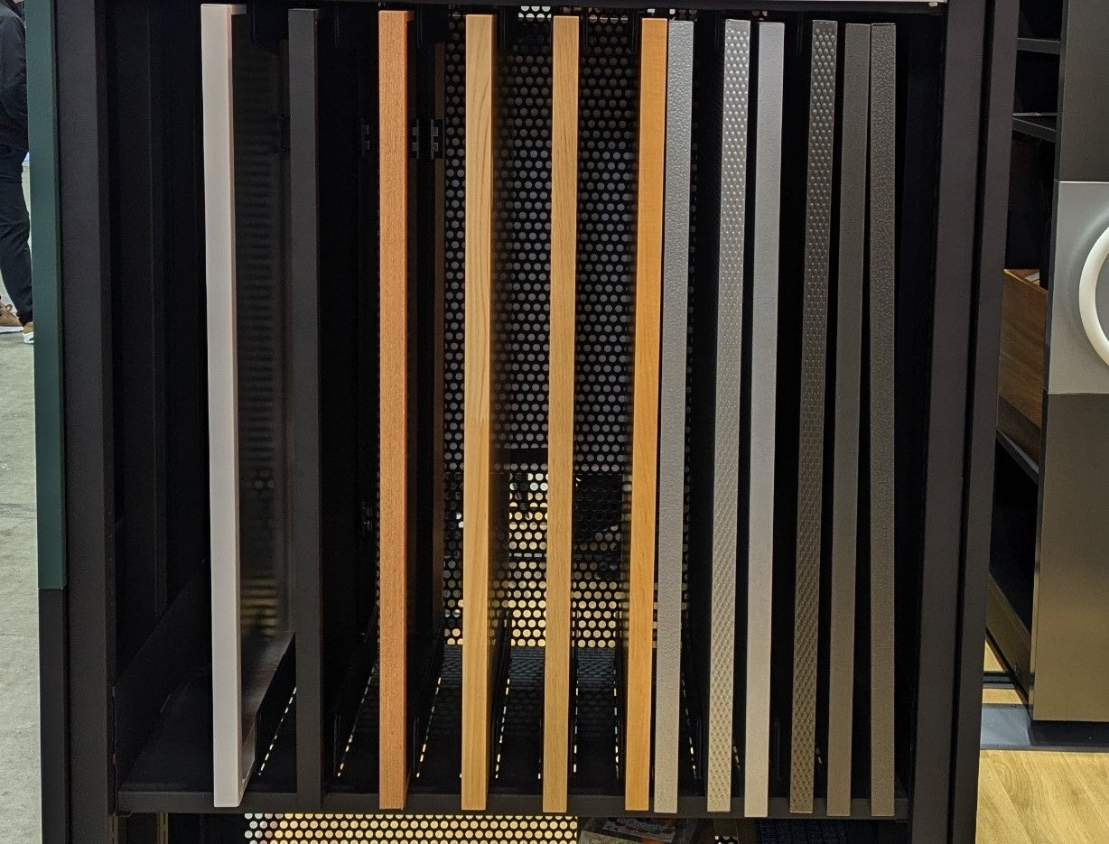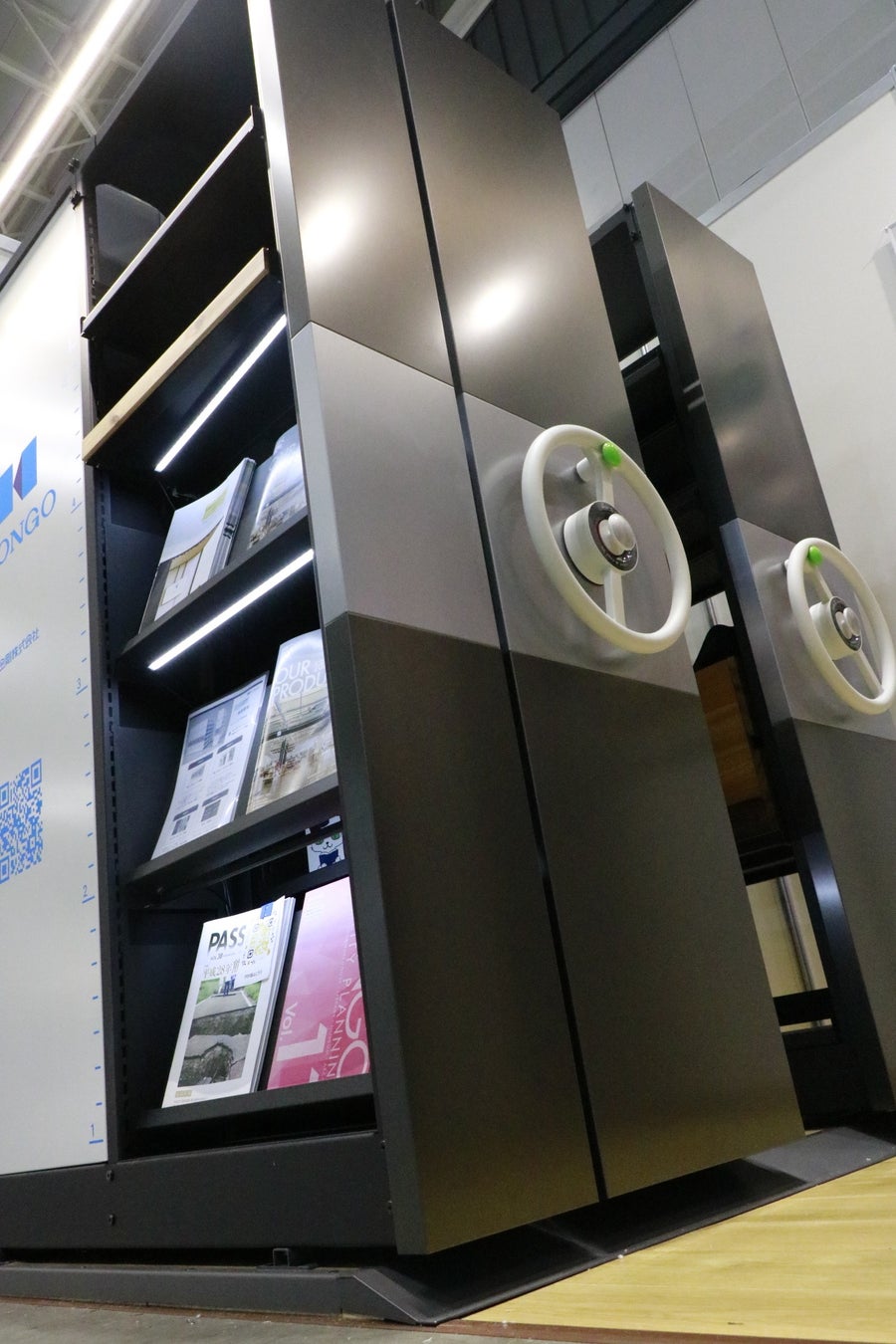 「普段人目に触れない移動棚のデザイン性を高めたい」という需要に応えるため、特殊素材「Feluce®(フェルーチェ)」を使用した丸ハンドル式移動棚AKZを展示しました。