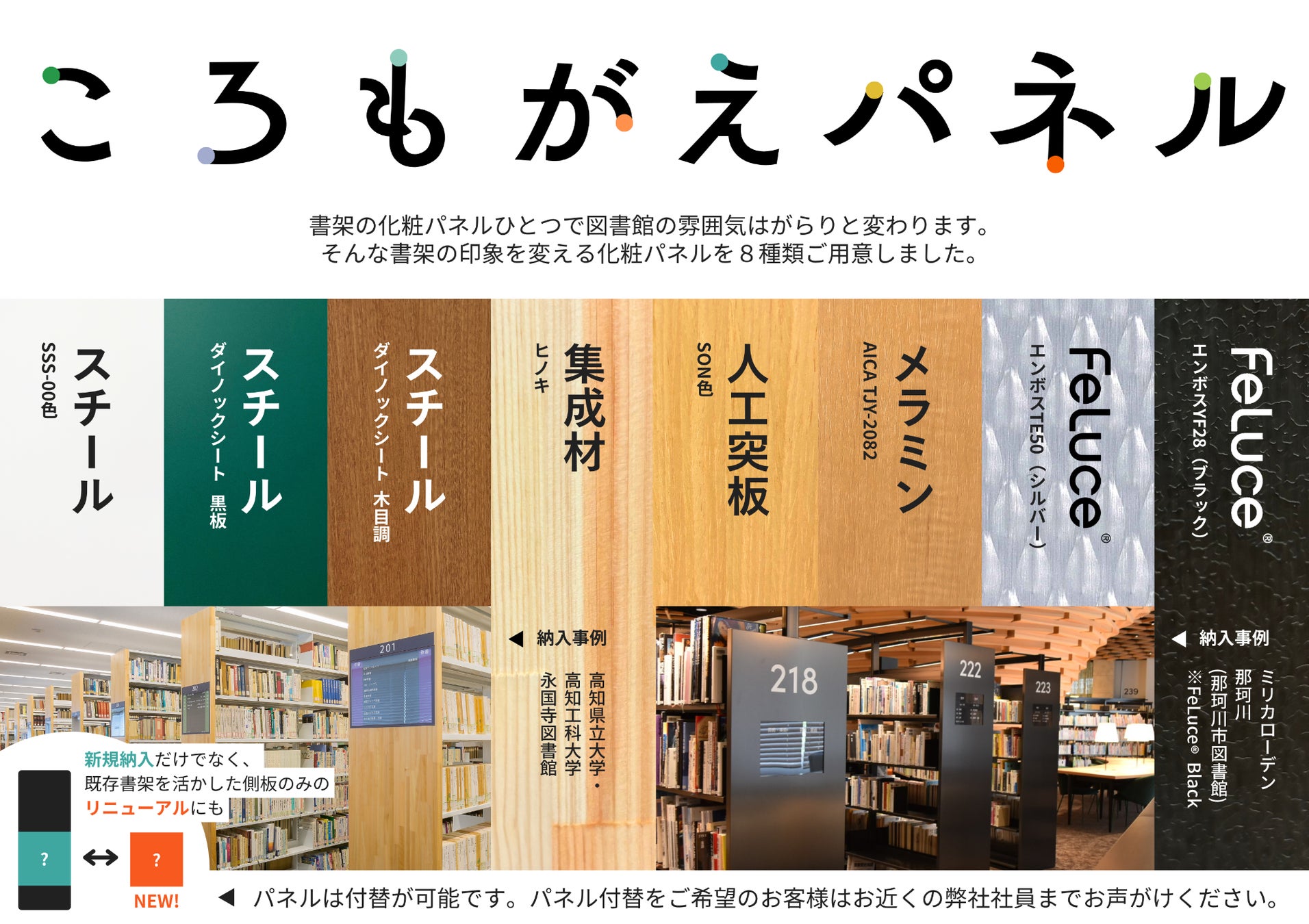 「洋服を着替えるように化粧パネルの付け替えを」をコンセプトに、書架側板のころもがえパネルをご用意しました。