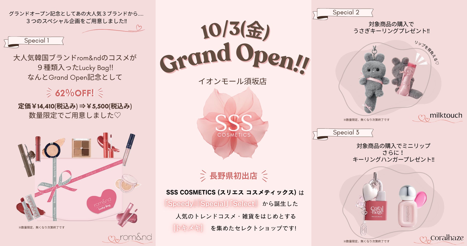 【長野県初出店】SSS COSMETICS イオンモール須坂店 人気のトレンドコスメ・雑貨が集まる「トキメキ」を集めたセレクトショップ。10/3(金)オープン記念特別企画を開催します!