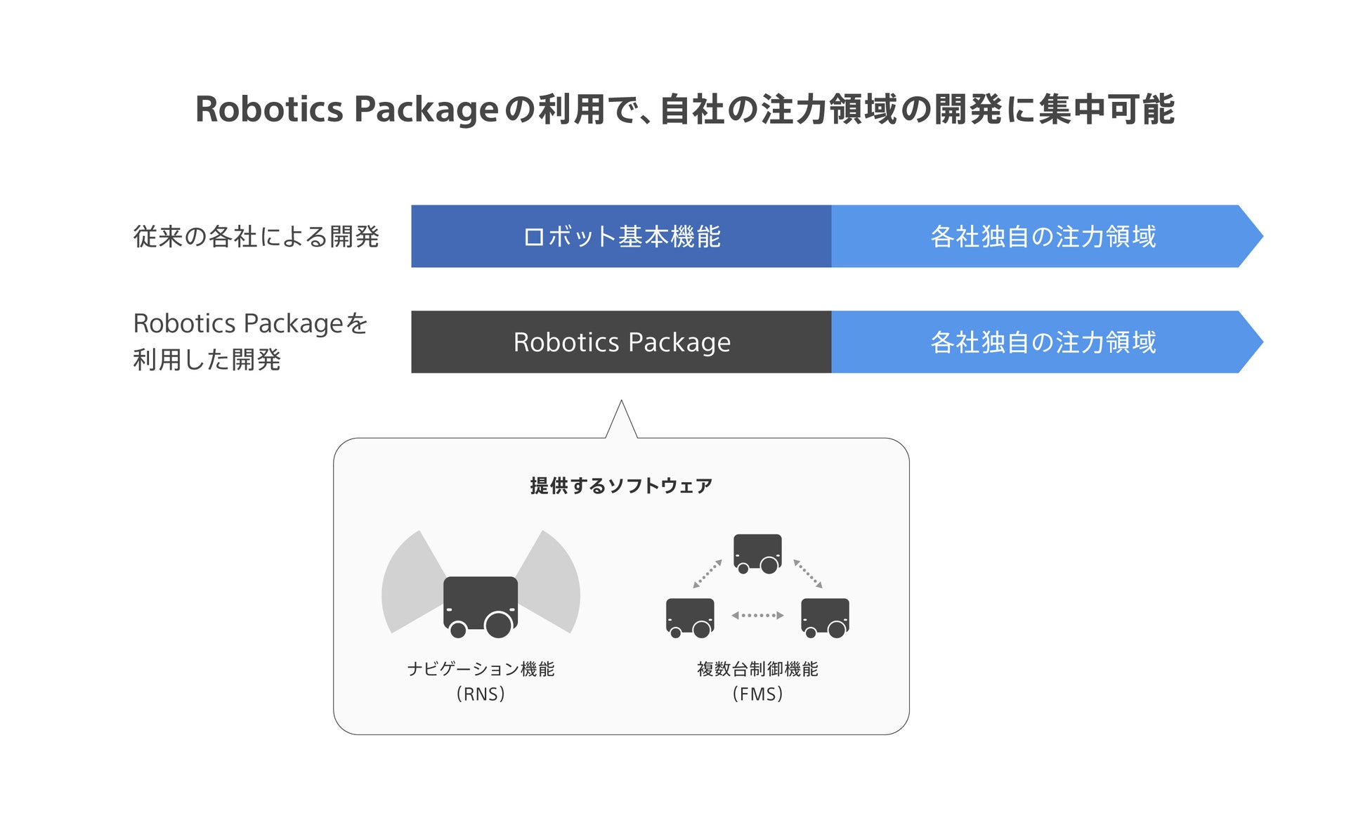 AMRの効率的な開発や導入、運用を可能にするソフトウェアRobotics Packageを出展します。