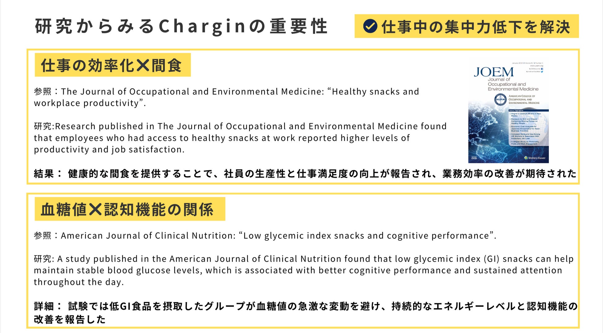 近年、仕事中の間食が集中力やストレス軽減に有効であることが多くの研究で明らかになっています。例えば、ナッツ摂取が認知機能向上につながるという研究や、間食がストレスレベルを下げるというデータも。Charginは、科学的エビデンスに基づき「食べることでパフォーマンスが上がるオフィス文化」をつくります。