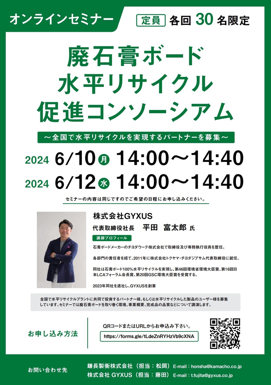 鎌長製衡様が2024年6月10日(月)、12日(水)に、オンラインセミナー「廃石膏ボード水平リサイクル促進コンソーシアム」を開催します。本セミナーに当社代表の平田富太郎が登壇します。