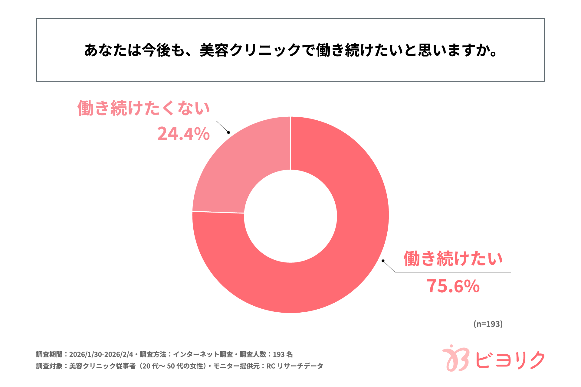 調査の最後、美容クリニック従事者を対象に「今後も美容クリニックで働き続けたいと思うか」を尋ねる設問への回答では、「働き続けたい」が75.6%、「働き続けたくない」が24.4%という結果になりました。この結果から、美容クリニック従事者の4人に3人以上が、今後も美容クリニックで働き続けたいと考えていることが判明しました。
