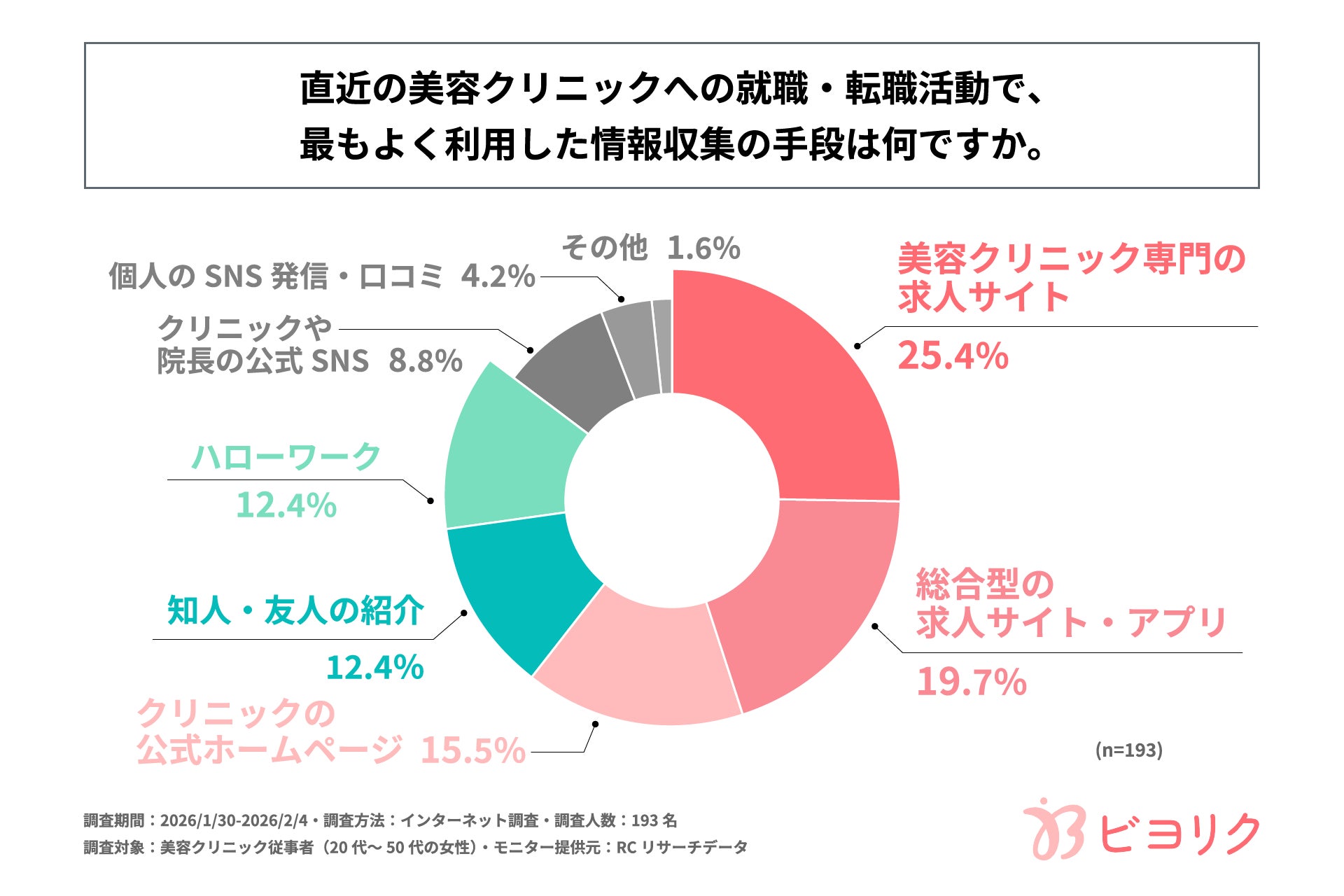 また、美容クリニック従事者を対象に「直近の美容クリニックへの就職・転職活動で、最もよく利用した情報収集の手段は何か」を尋ねる設問への回答では、1位が「美容クリニック専門の求人サイト」で25.4%、2位が「総合型の求人サイト・アプリ」で19.7%、3位が「クリニックの公式ホームページ」で15.5%という結果になりました。この結果から、直近の美容クリニックへの就職・転職活動において、最もよく利用した情報収集の手段は「美容クリニック専門の求人サイト」であることがわかりました。