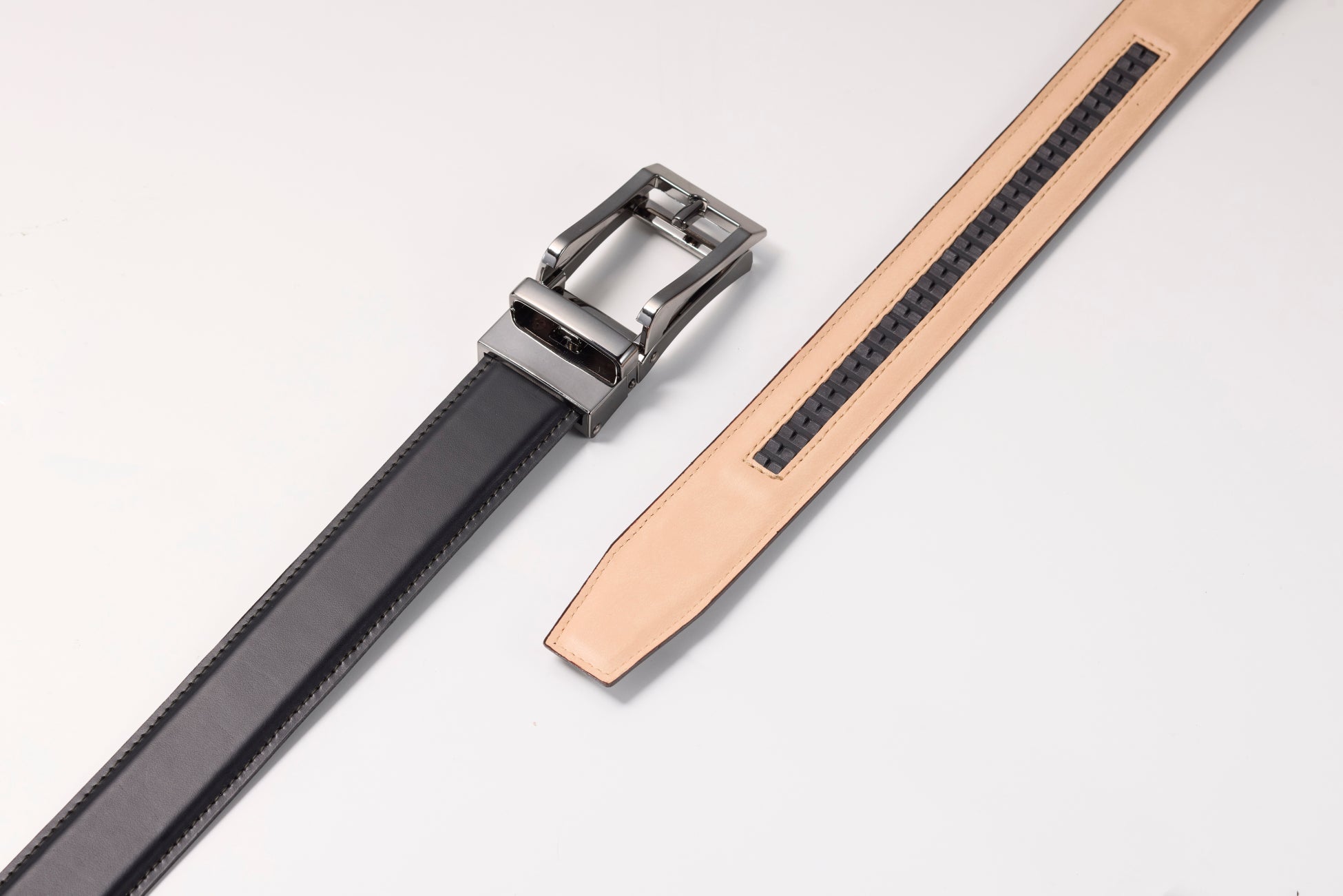 ベルトの締めはずしはバックルの上げ下げだけ。ワンアクションでさり気なく、ミリ単位のサイズ調整がベルトを締めたままで可能です。帯裏のレールにバックルストッパーが噛み合いしっかりと止まり、簡単操作で締め緩めや着脱が可能なので快適な締め心地です。